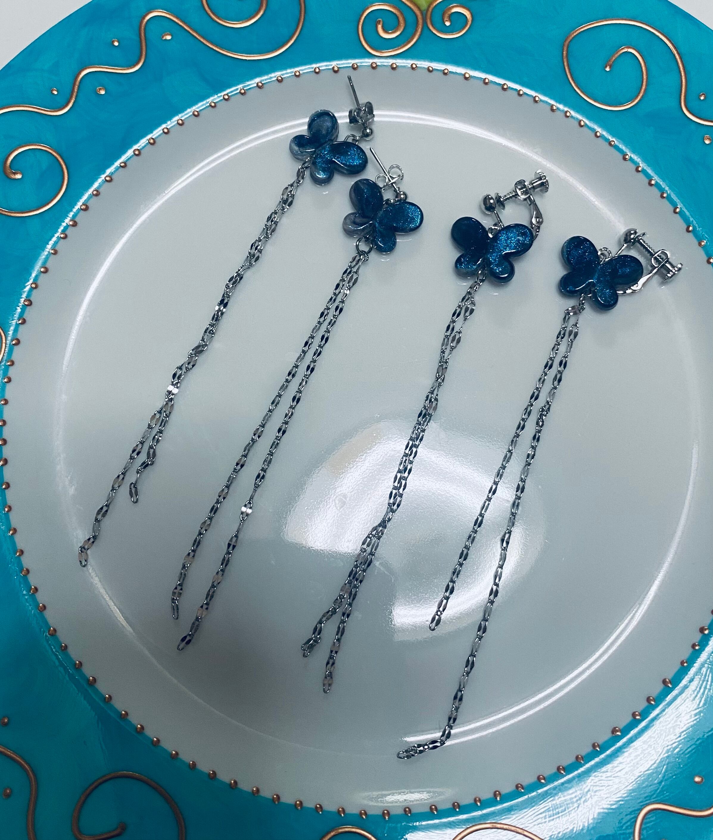 ブルーのバタフライチャームに、シルバーカラーのロングのペダルチェーンを二重にしたものを合わせました。