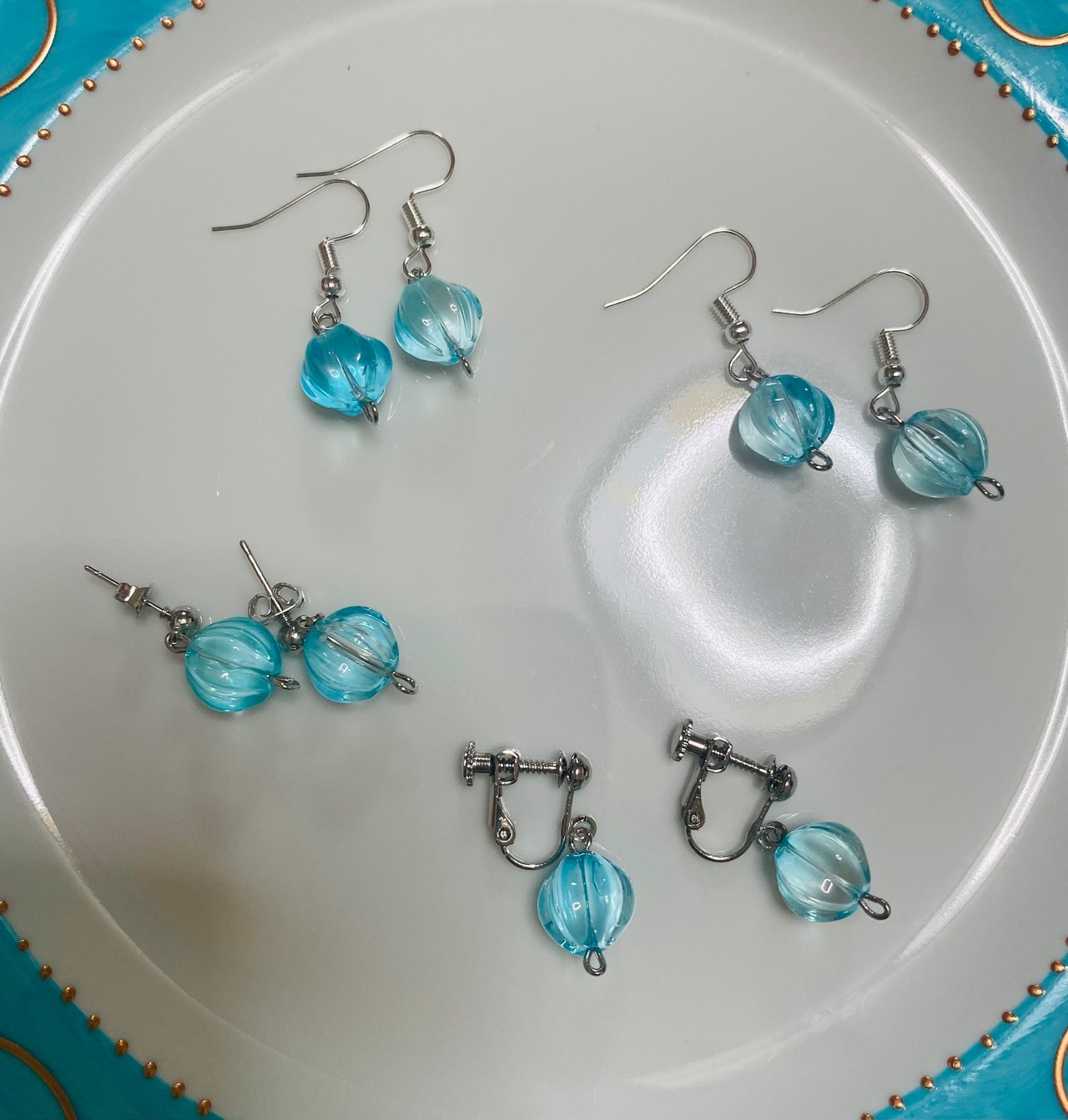 直径約1㎝くらいの、とても綺麗な透け感のあるライトブルーのビーズを耳飾りにしました。