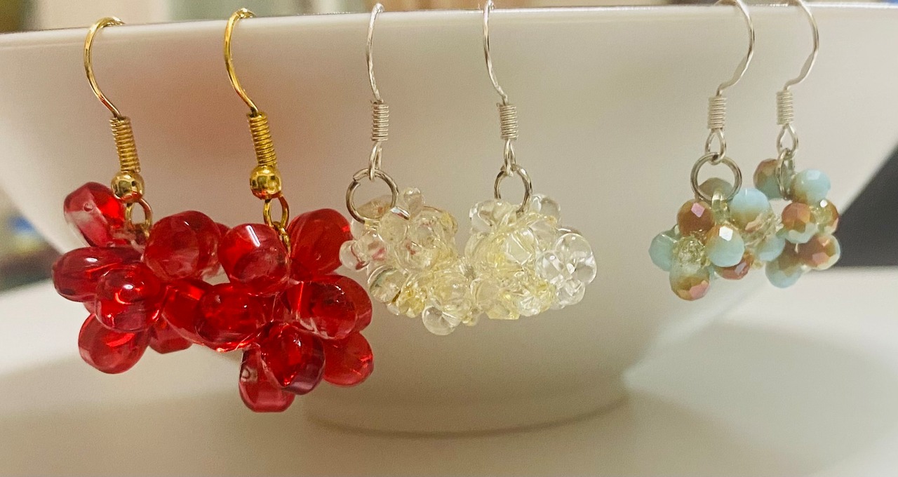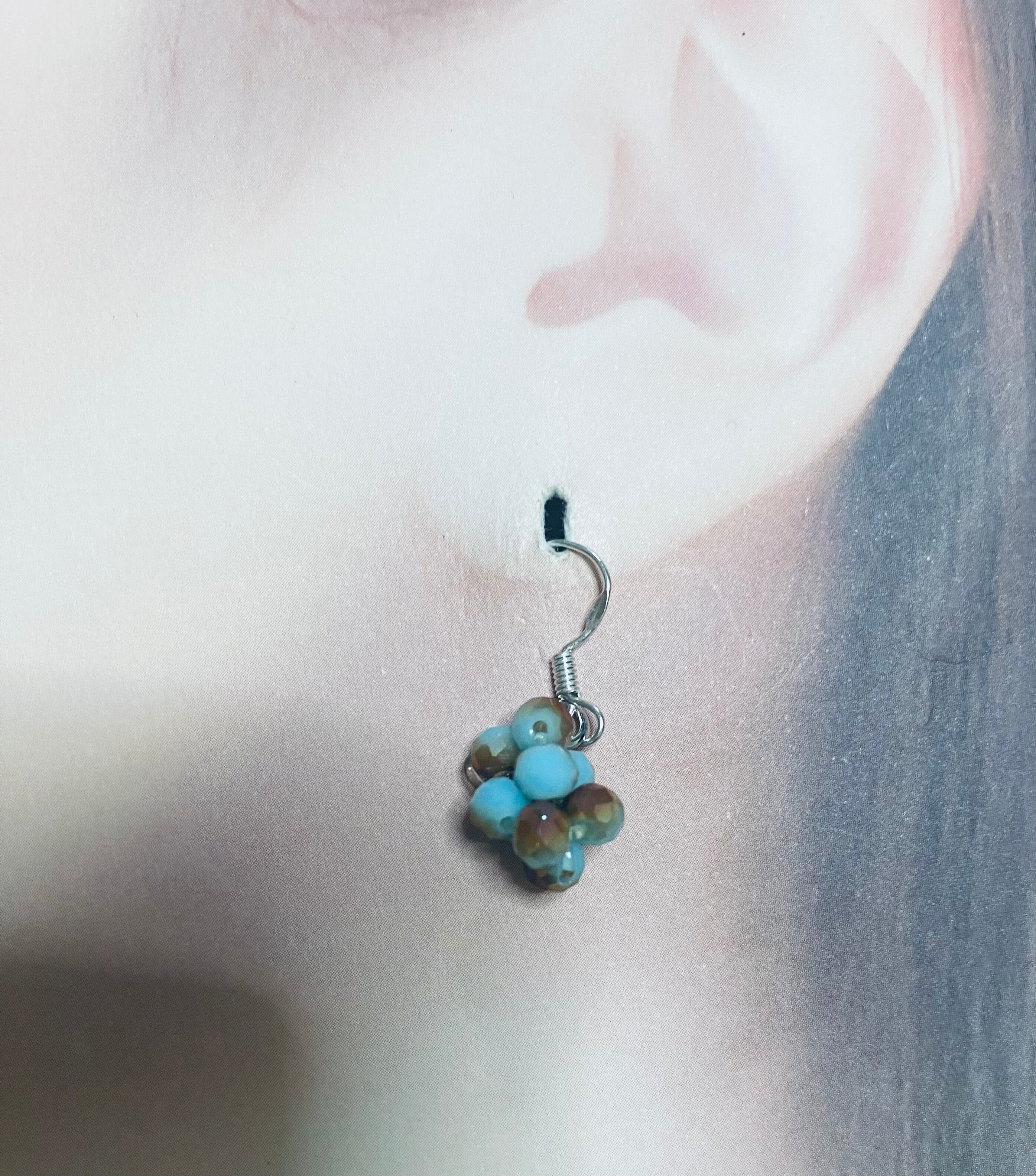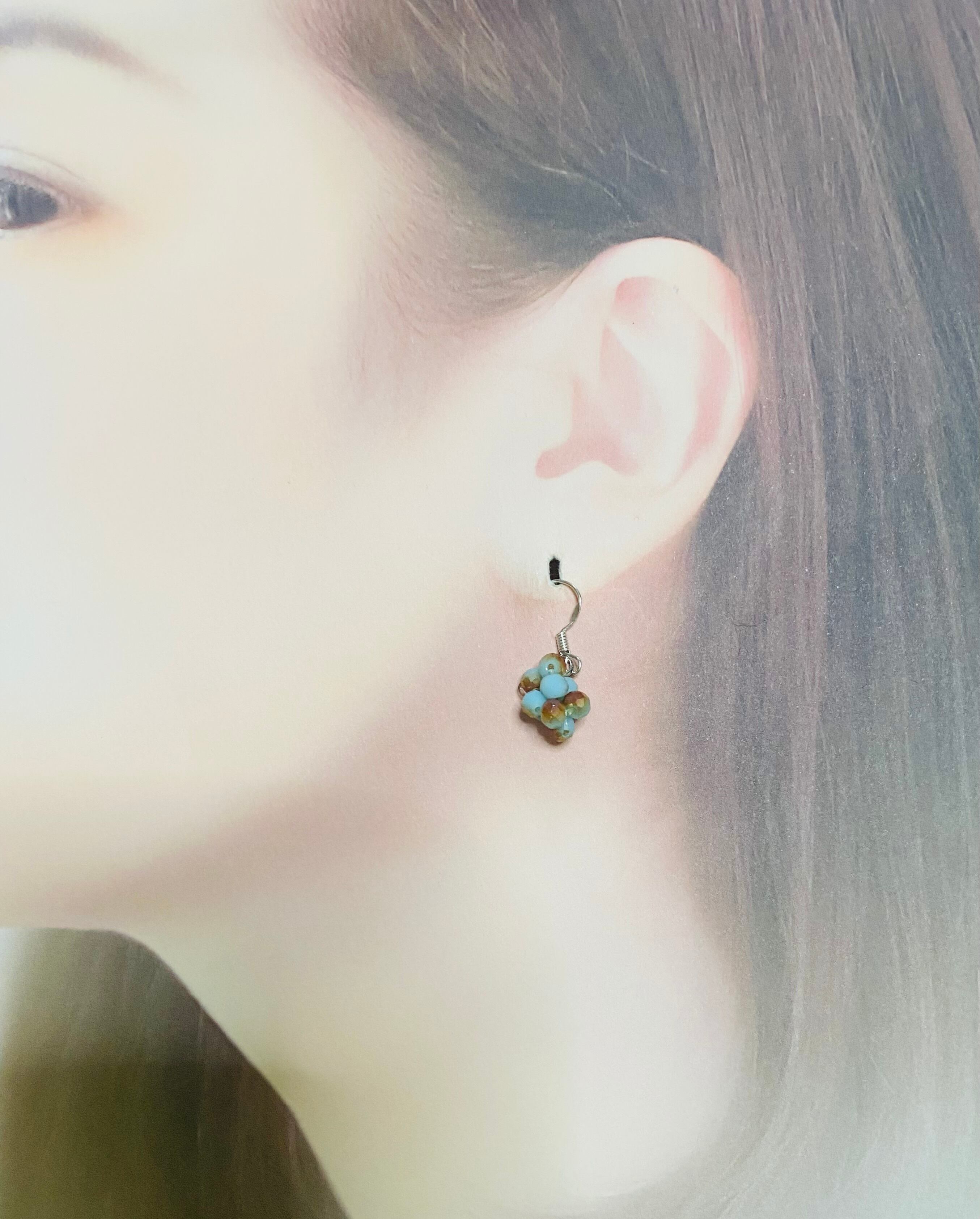 アクアマリンカラーのガラスビーズを、テグスで直径約1.5㎝くらいのクラスタにしています。