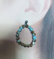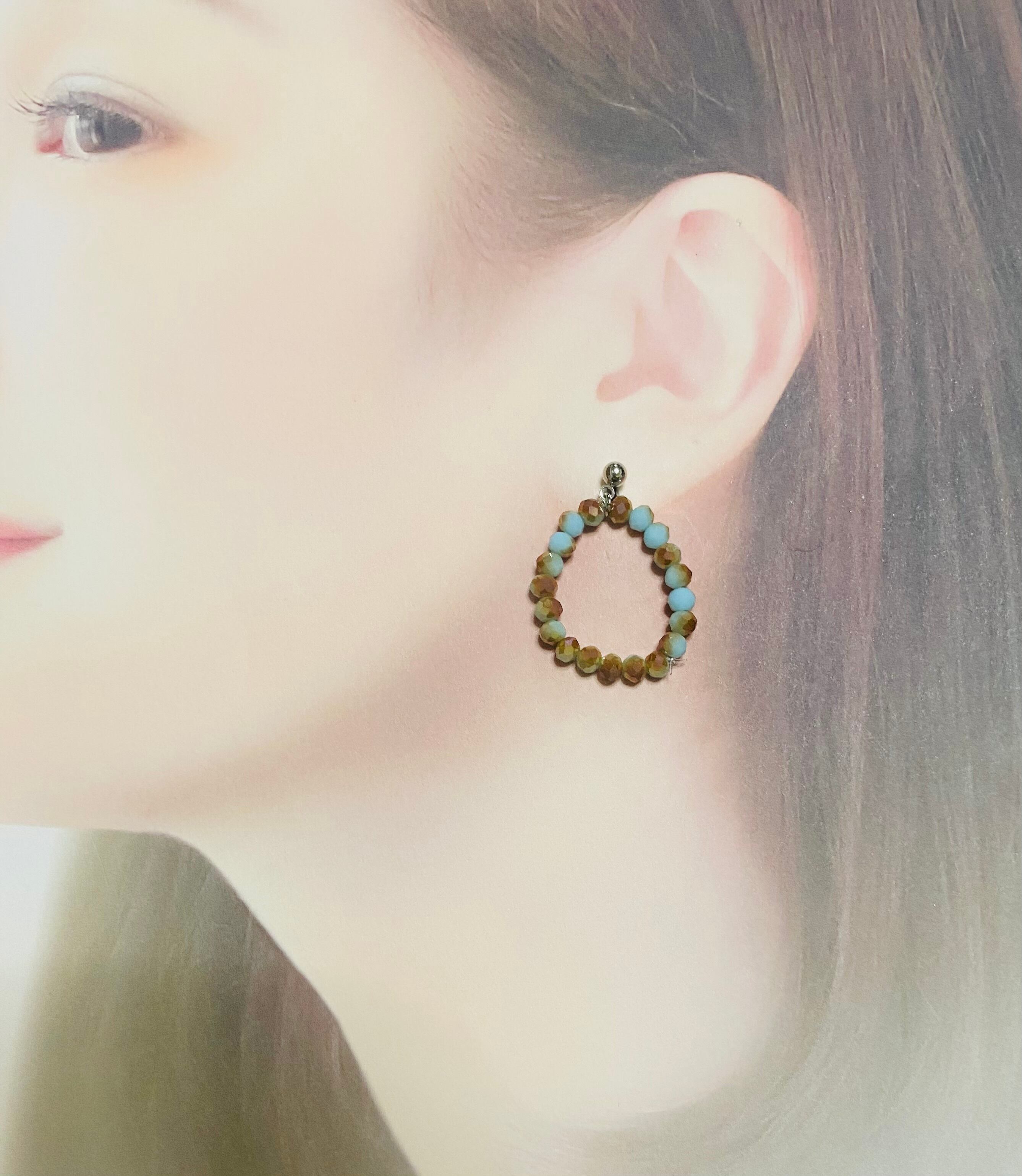 アクアマリンと光るブラウンの混じった3〜4ミリ大のガラスビーズで、リングを作ってそれをピアスとイヤリングにしました。