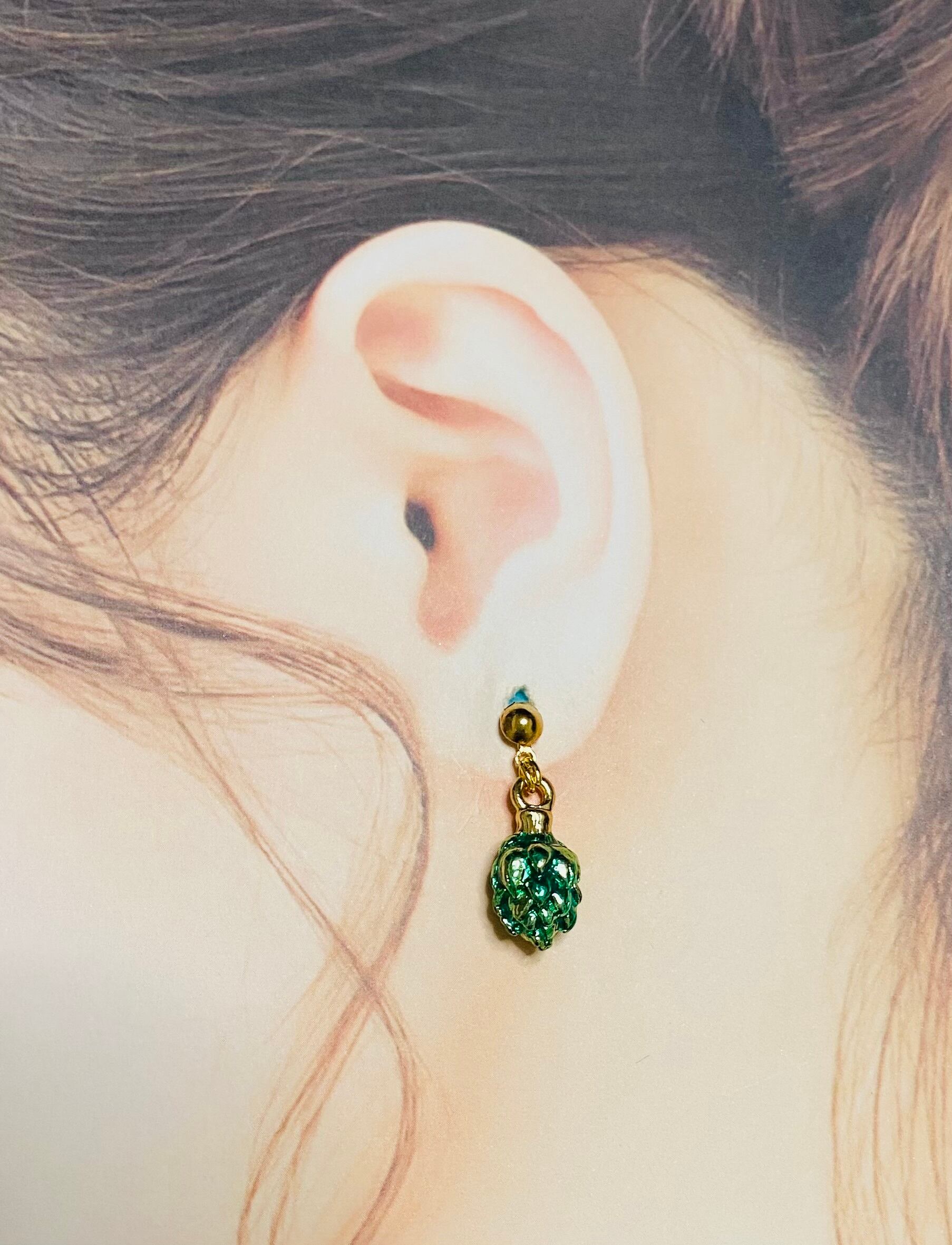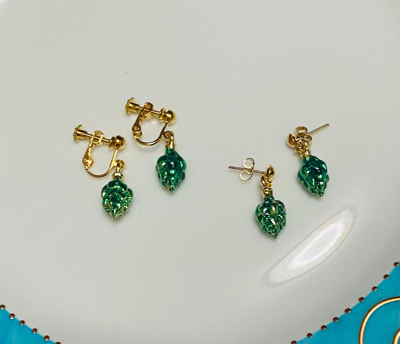 綺麗なグリーンカラーのホップのようなチャームを、ピアスとイヤリングにしました。