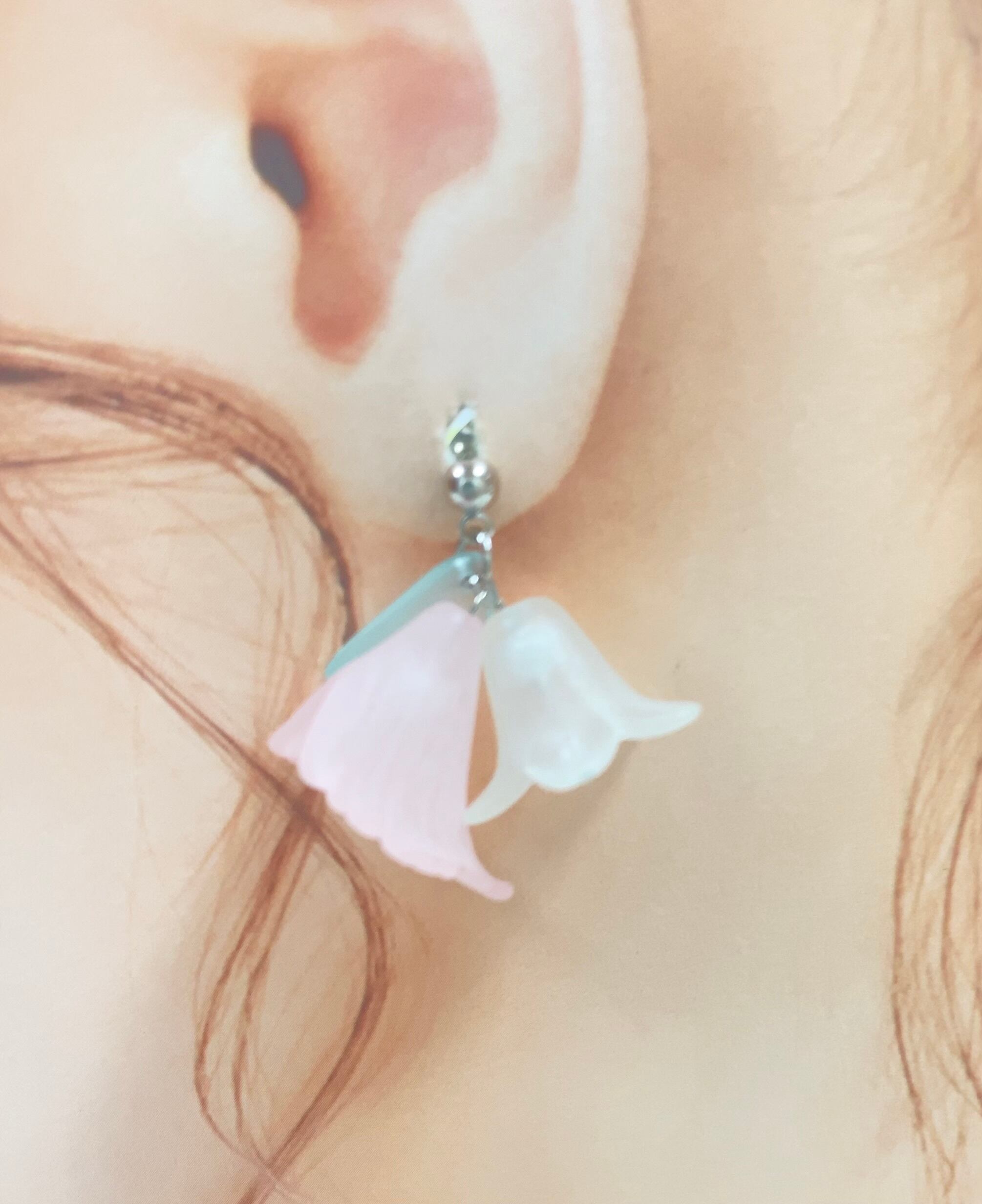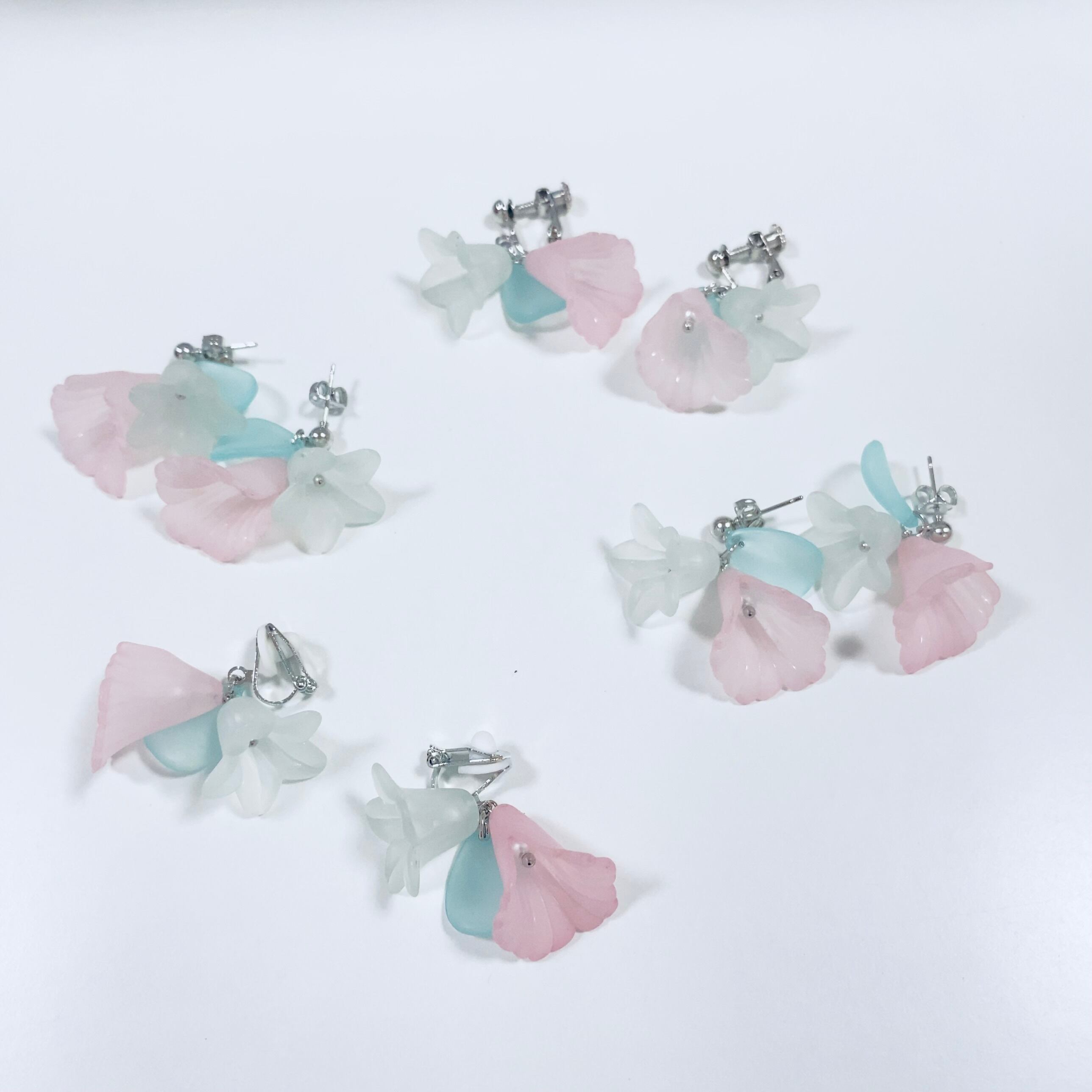 中にちぃさなイミテーションパールを合わせた、薄いピンクと白に近い薄いブルーのお花のピアスとイヤリングです。