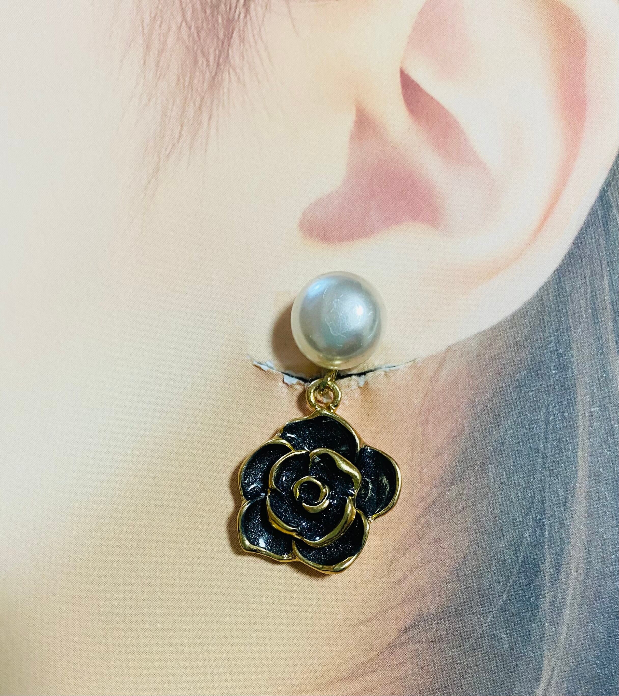 パールとゴールドの縁取りごされたブラックローズを合わせたイヤリングです。