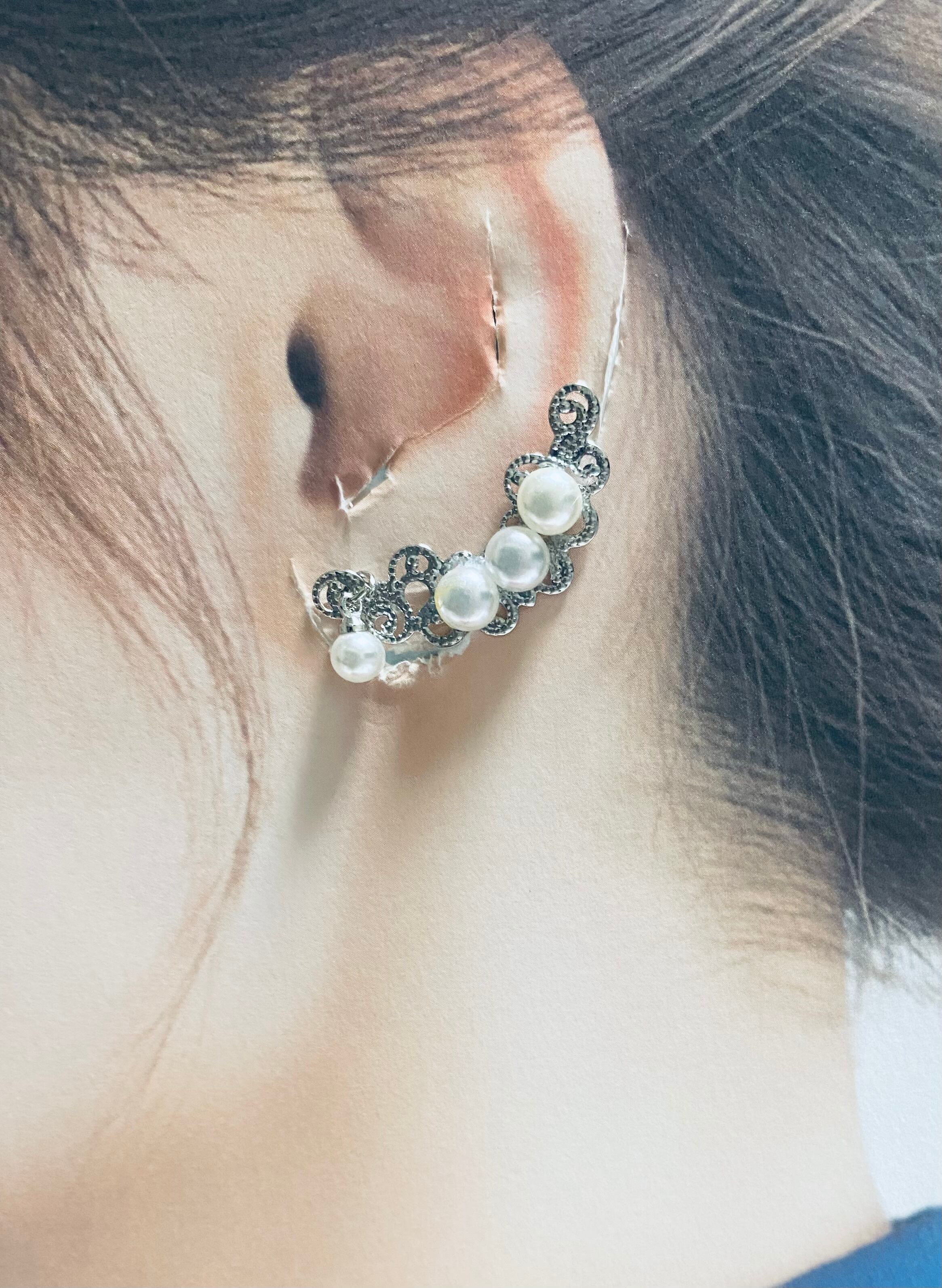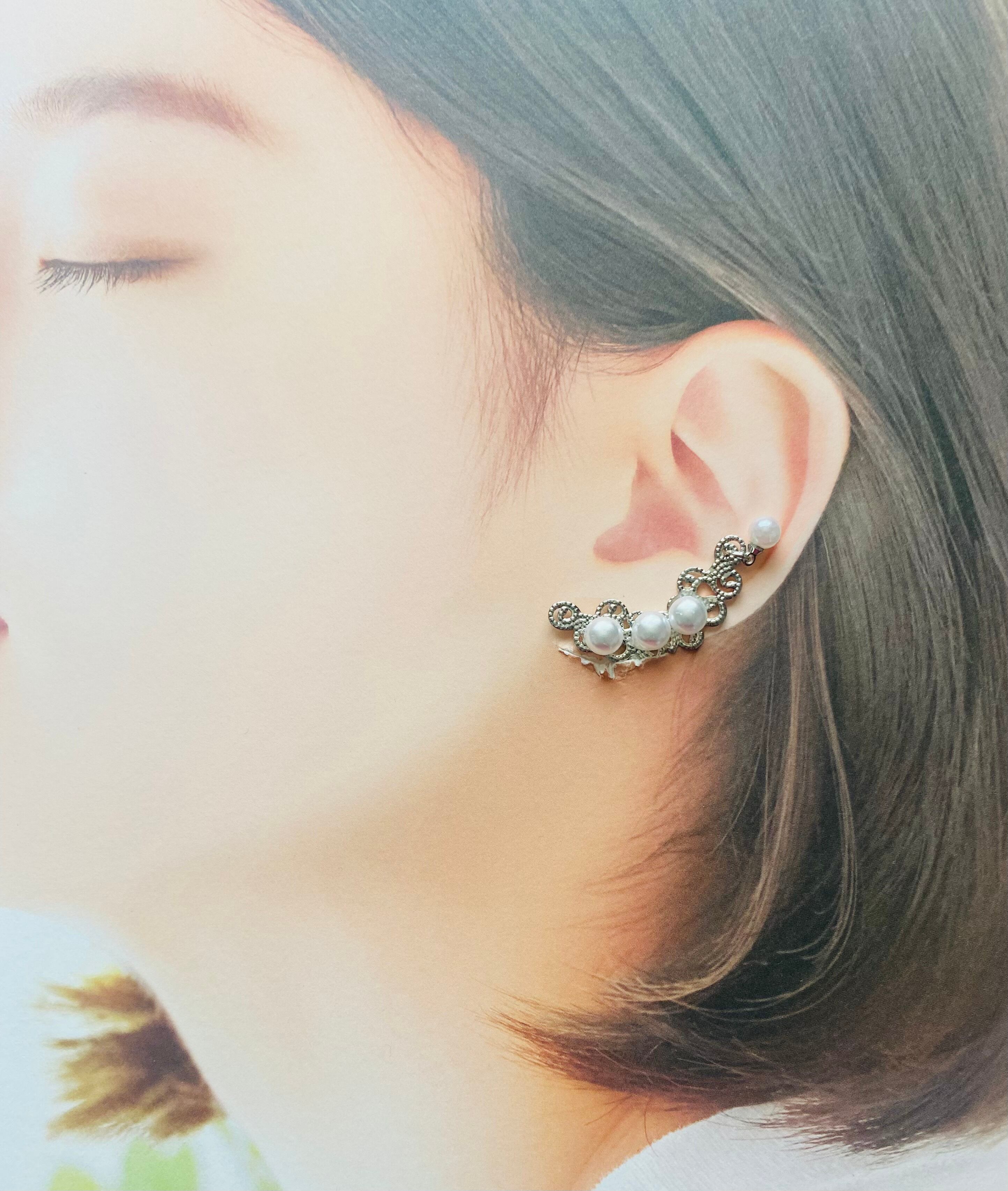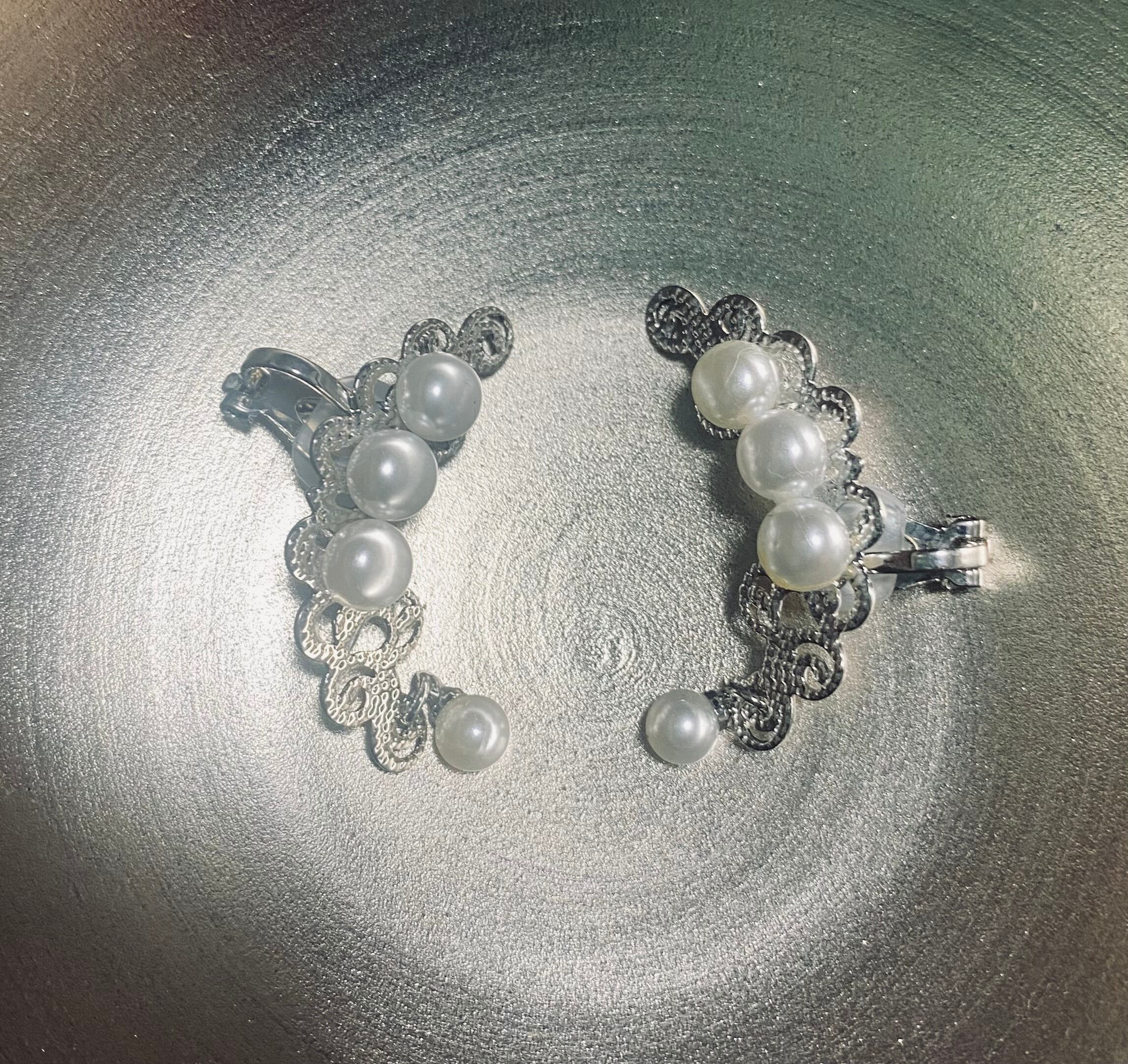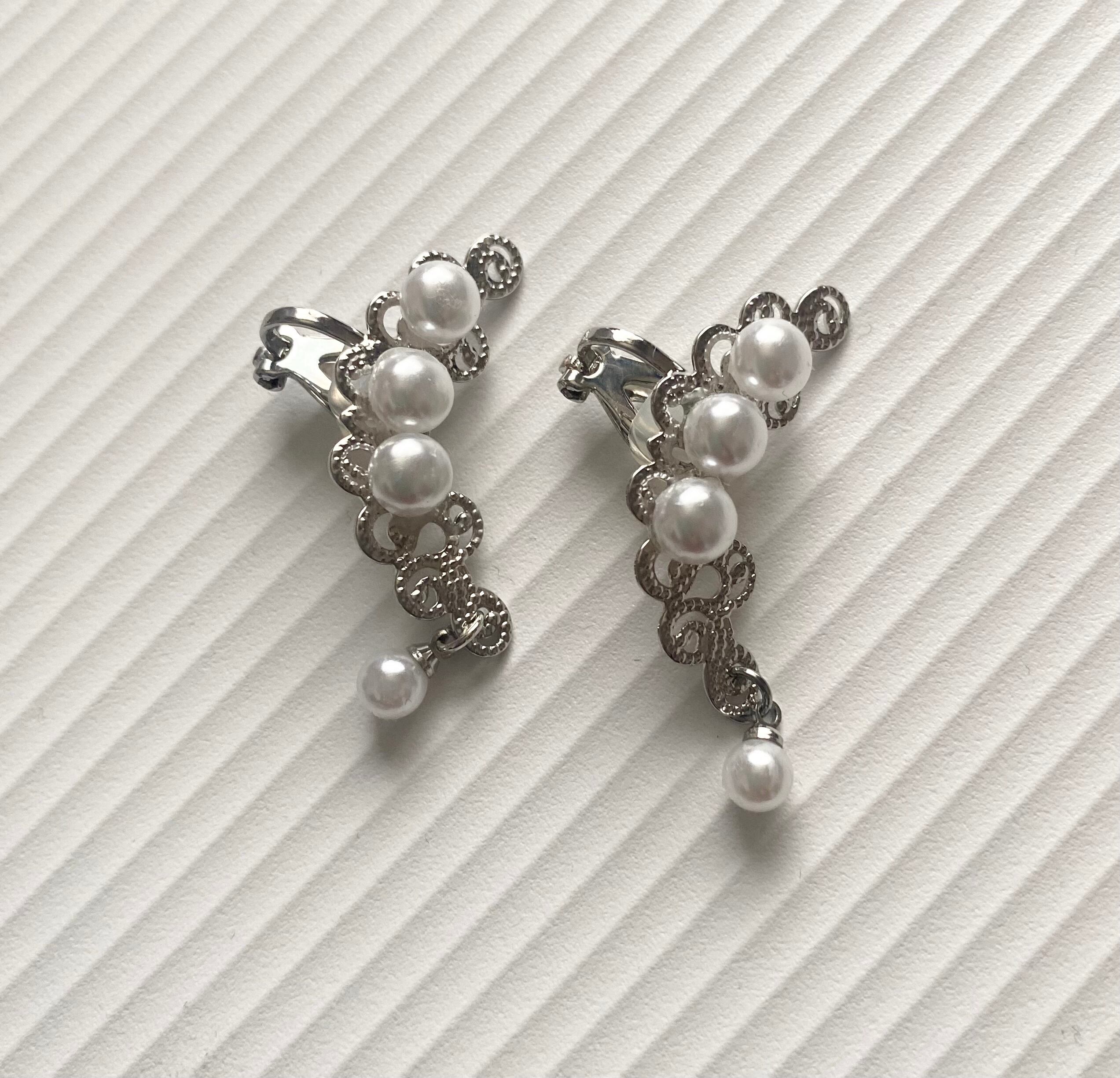 シルバーカラーの透かしフラワー模様のイヤークリップに、パールを装着しました。下にはちぃさなパールを付けて、動きに合わせて揺れるのが可愛いです。