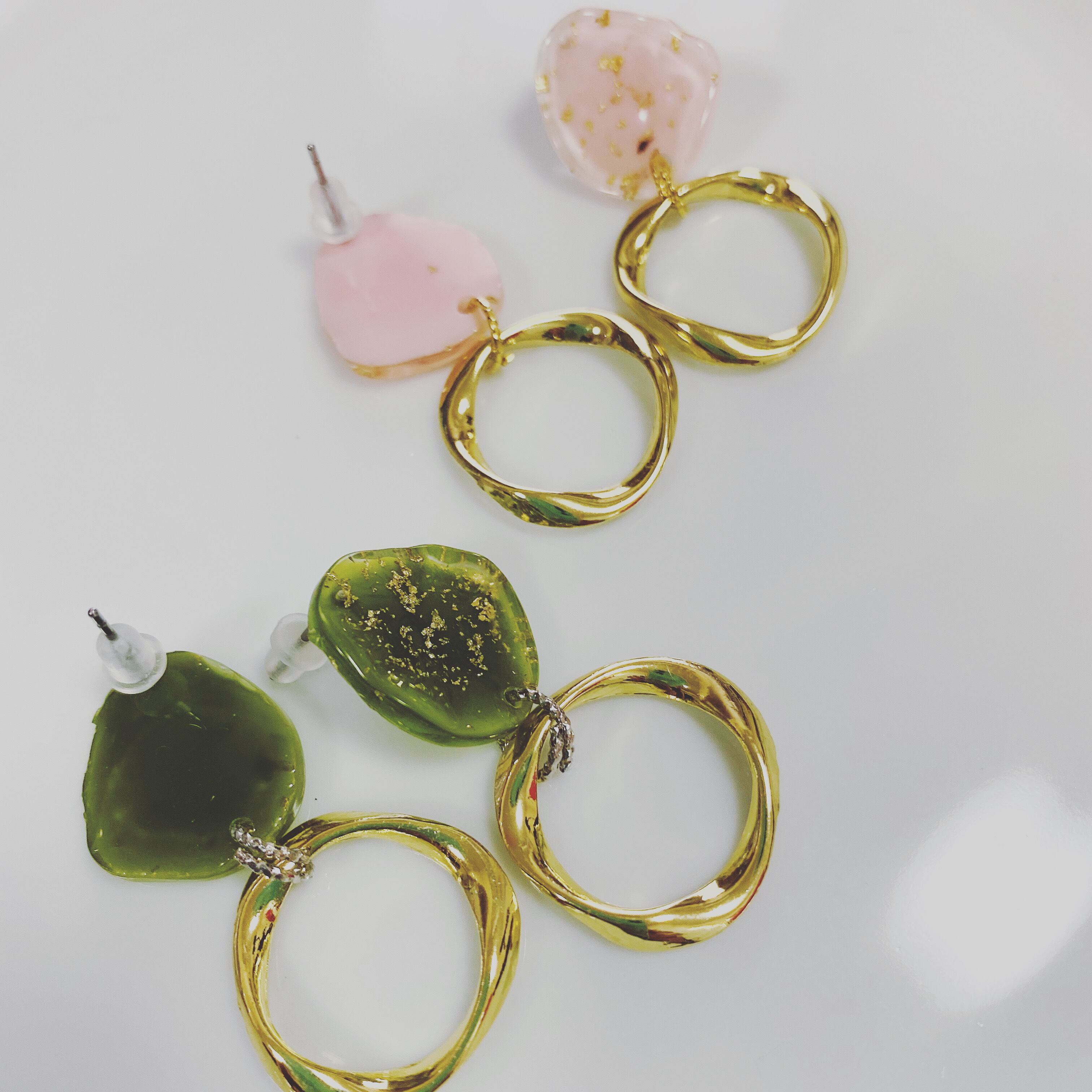 ピンクやグリーンに金箔が入ったピアスにゴールドリングを付けてお洒落可愛いピアスに仕上がりました*