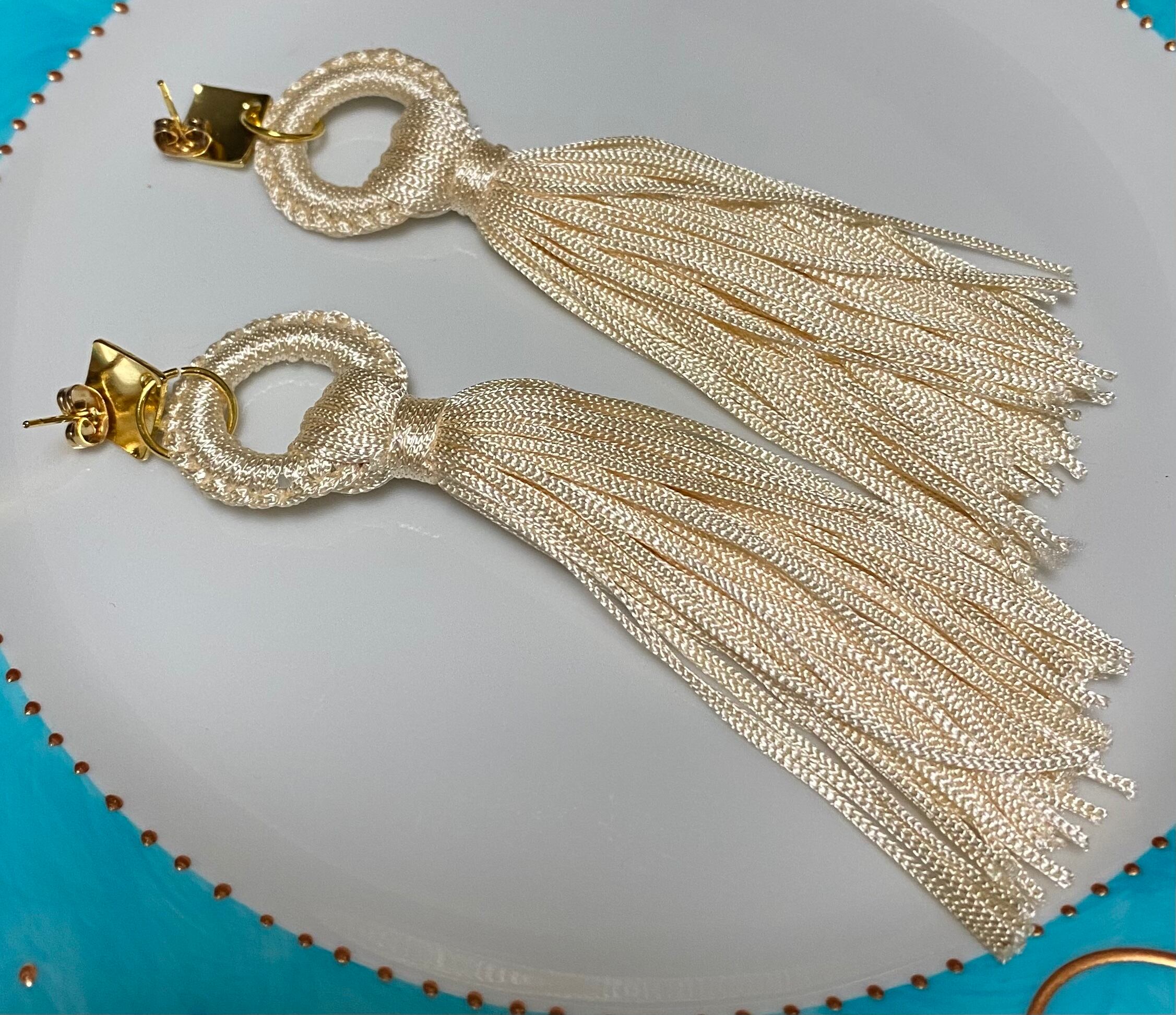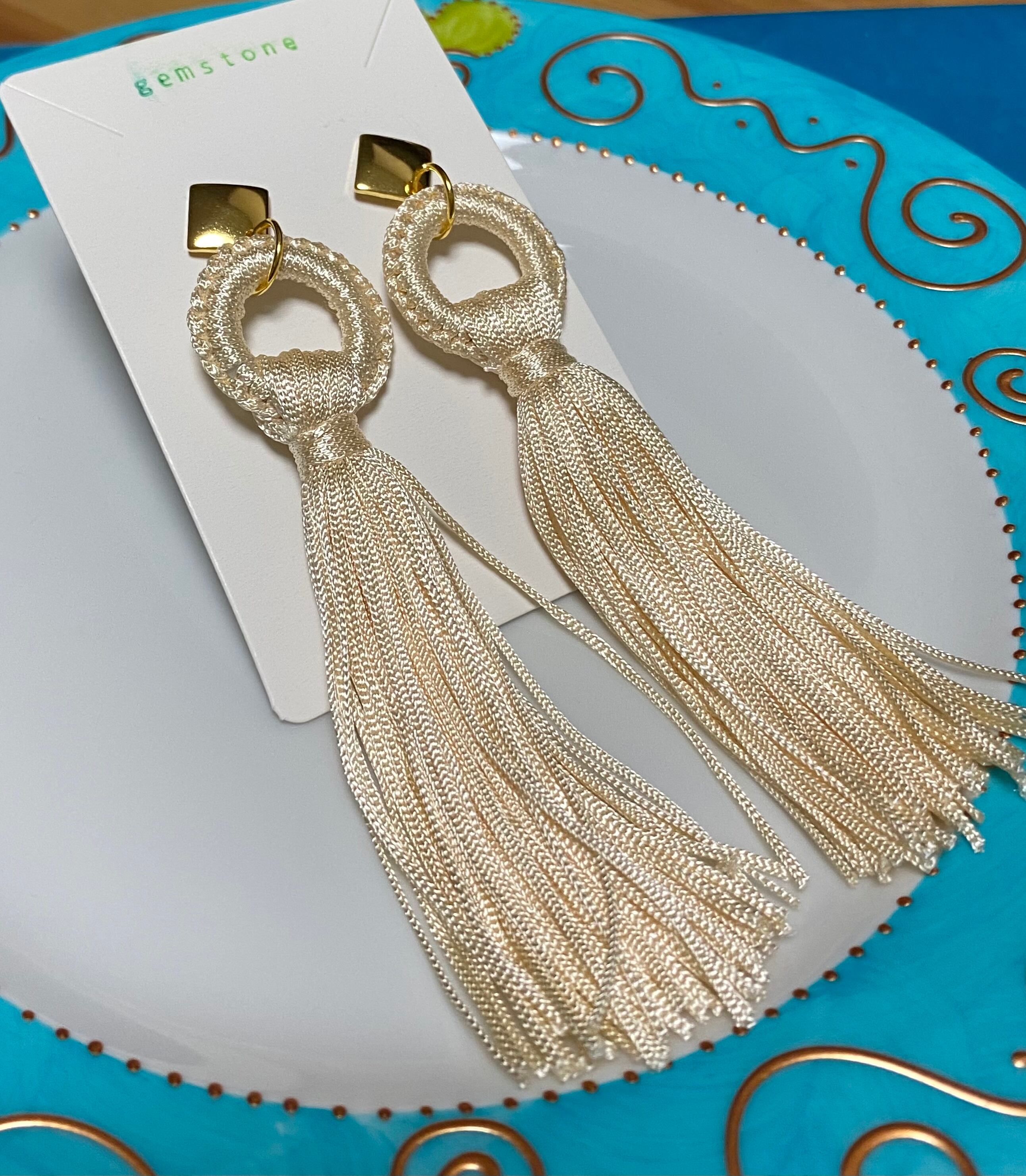 大振りなタッセルピアスですが、色がホワイトなので合わせやすいと思います( ´ ▽ ` )