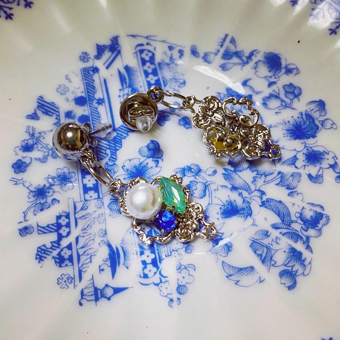 シルバープレートの上に、パールやグリーン、ブルーのビーズを載せて、シルバーのカボションと合わせたピアスにしました♡