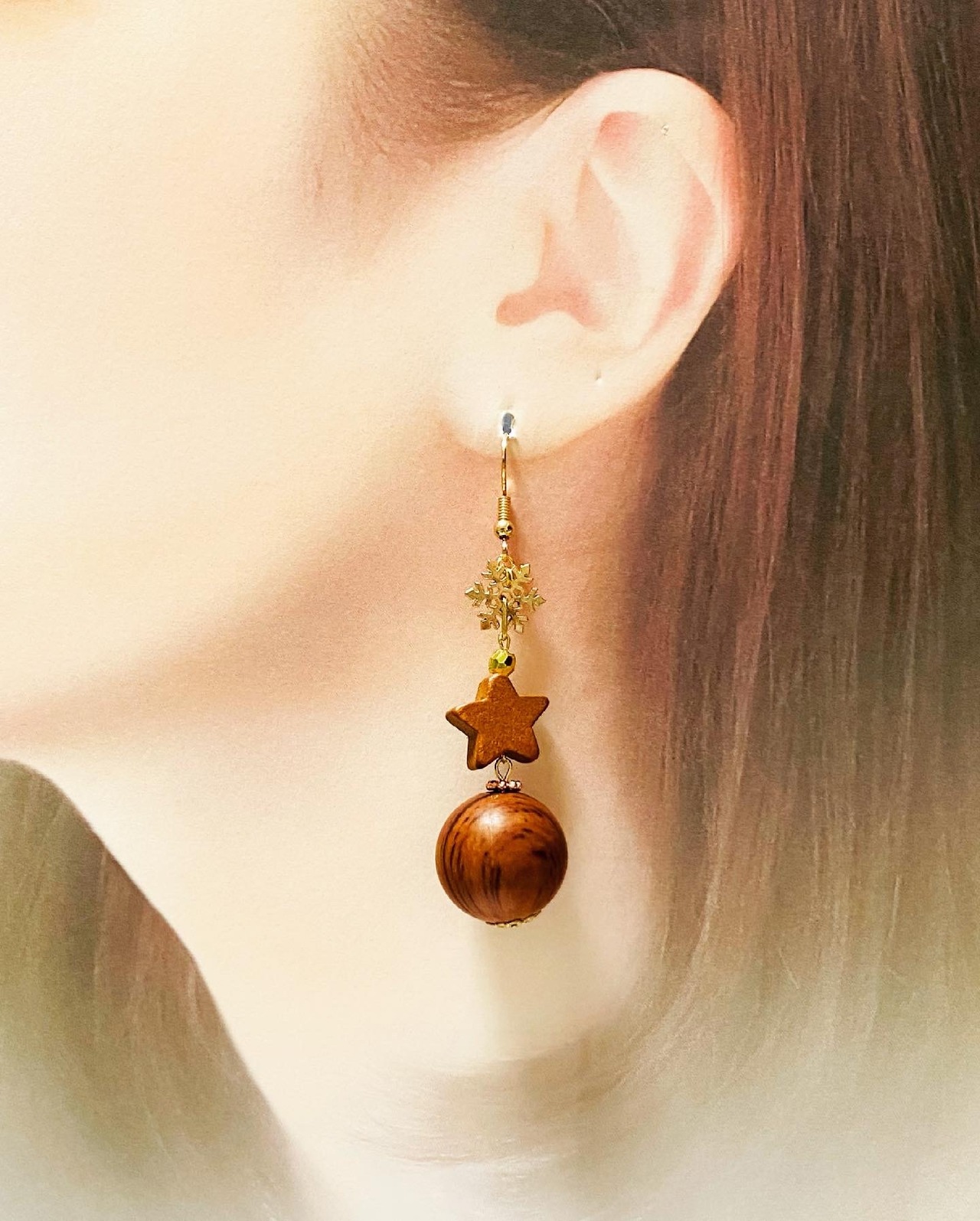 ウッドのまんまるボールとお星さまにゴールドの星とフックピアスを合わせました( ´ ▽ ` )