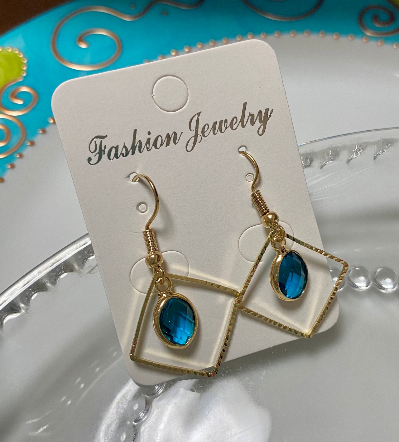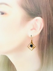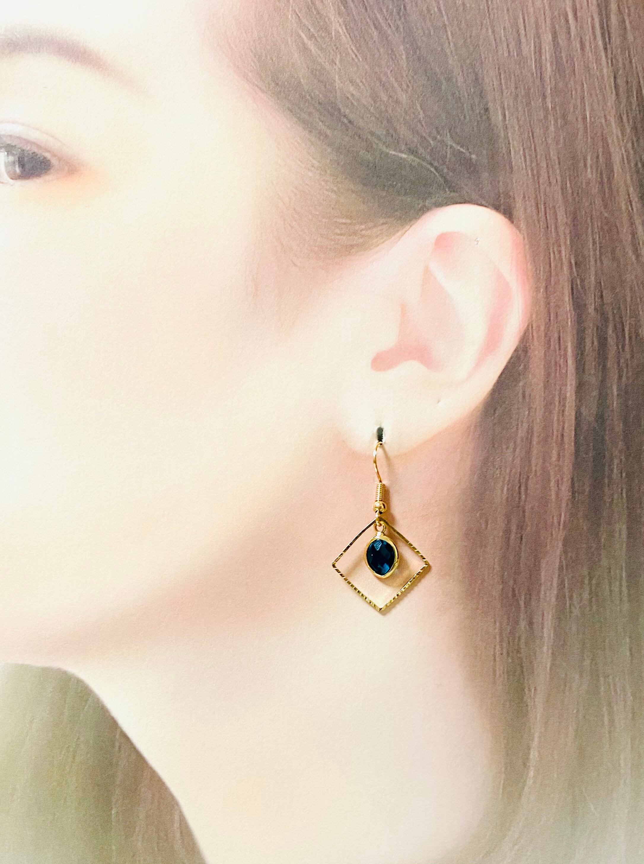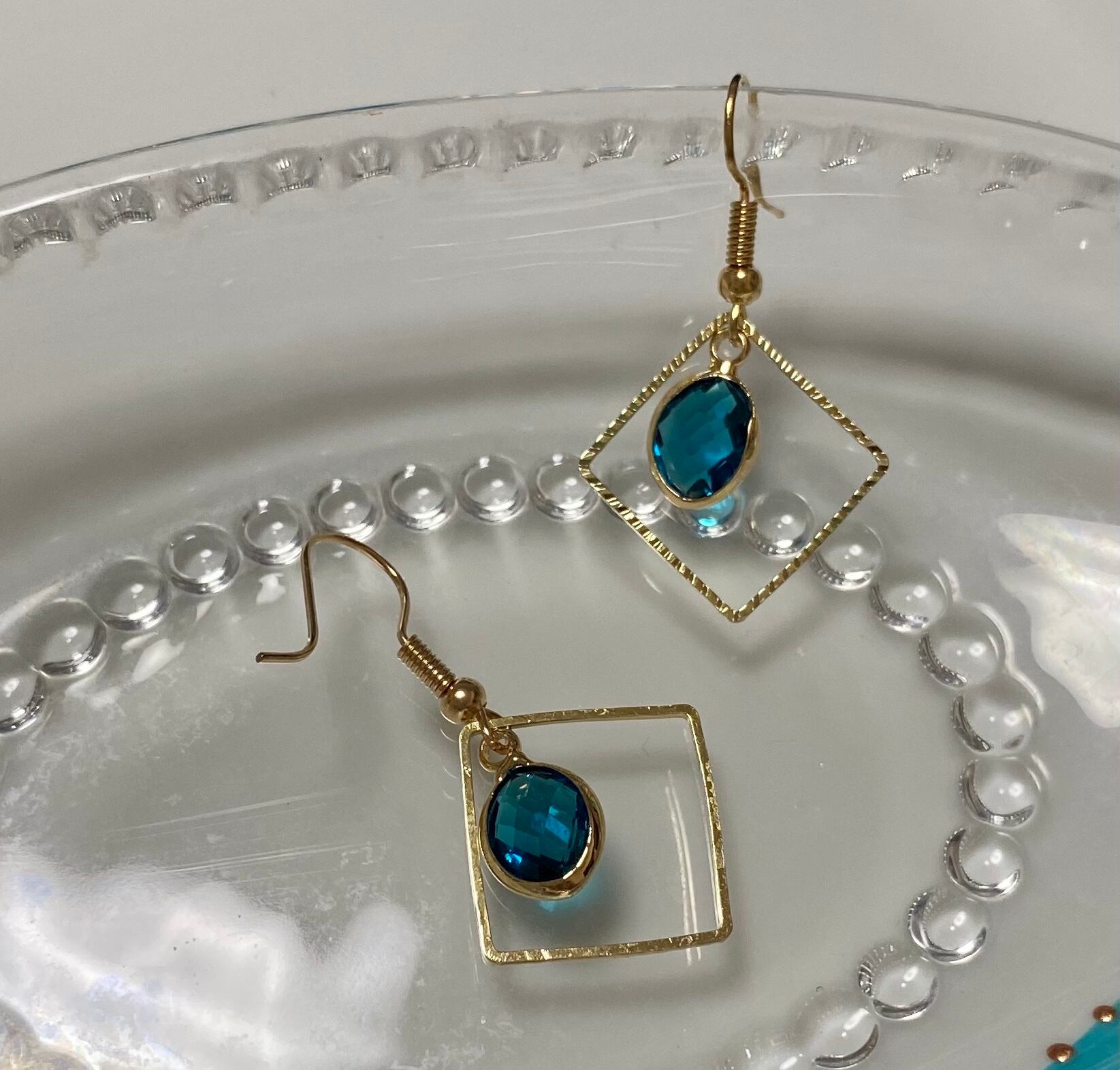 ブルーのストーンとゴールドのキラキラ光るスクエアが揺れるフックピアスです♡