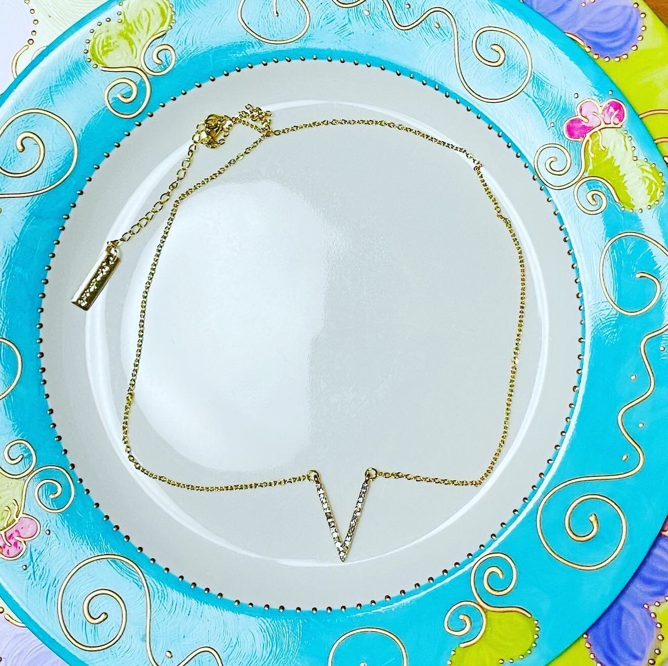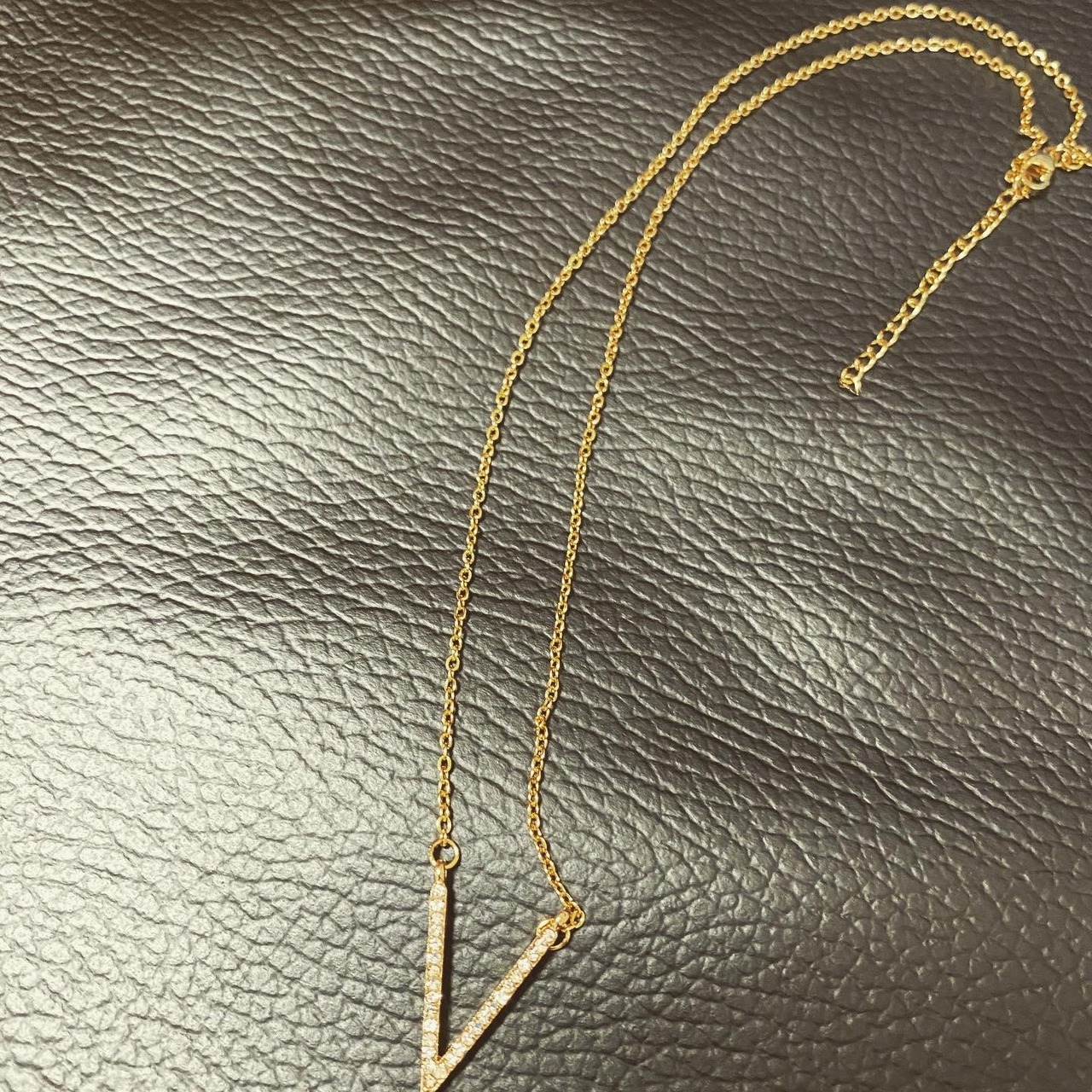 ペンダントトップがビジューのVのゴールド系のペンダントです。