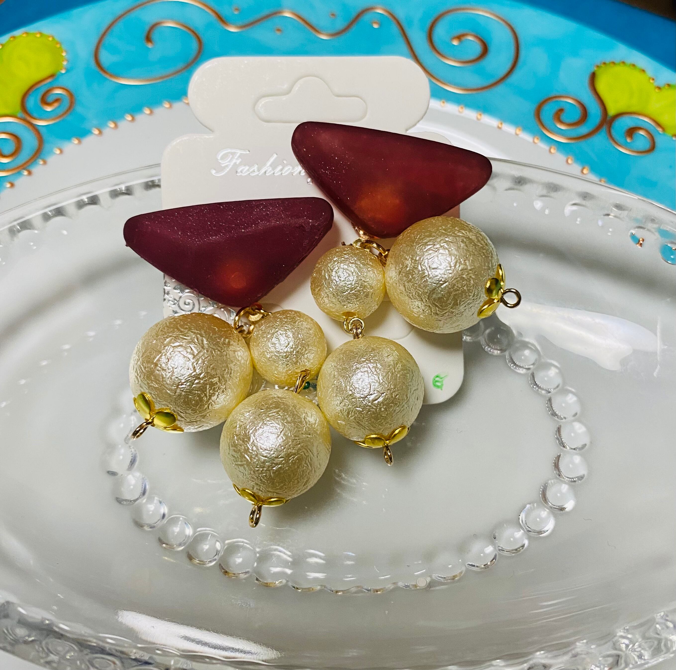 赤紫のトライアングルの カポションに、18mmと 16mm、12mmの模造パールを合わせたピアスです。