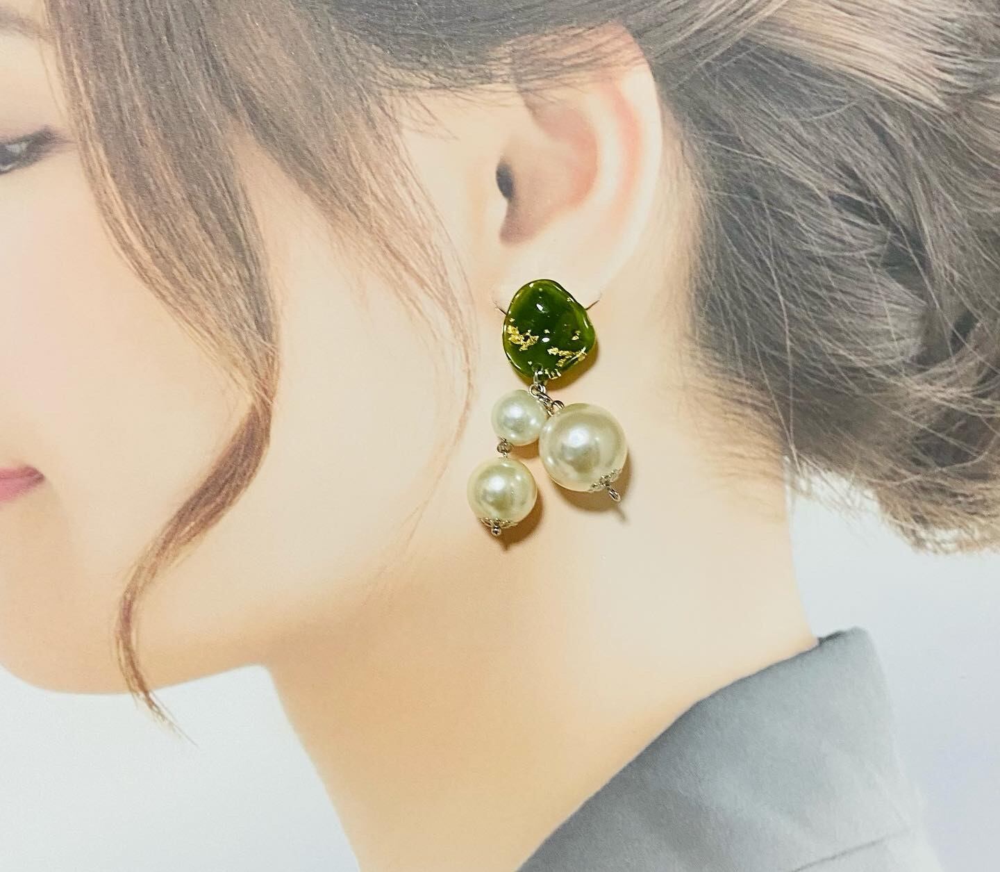 グリーンやピンクのカボションに、様々な大きさのパールを合わせたピアスです。