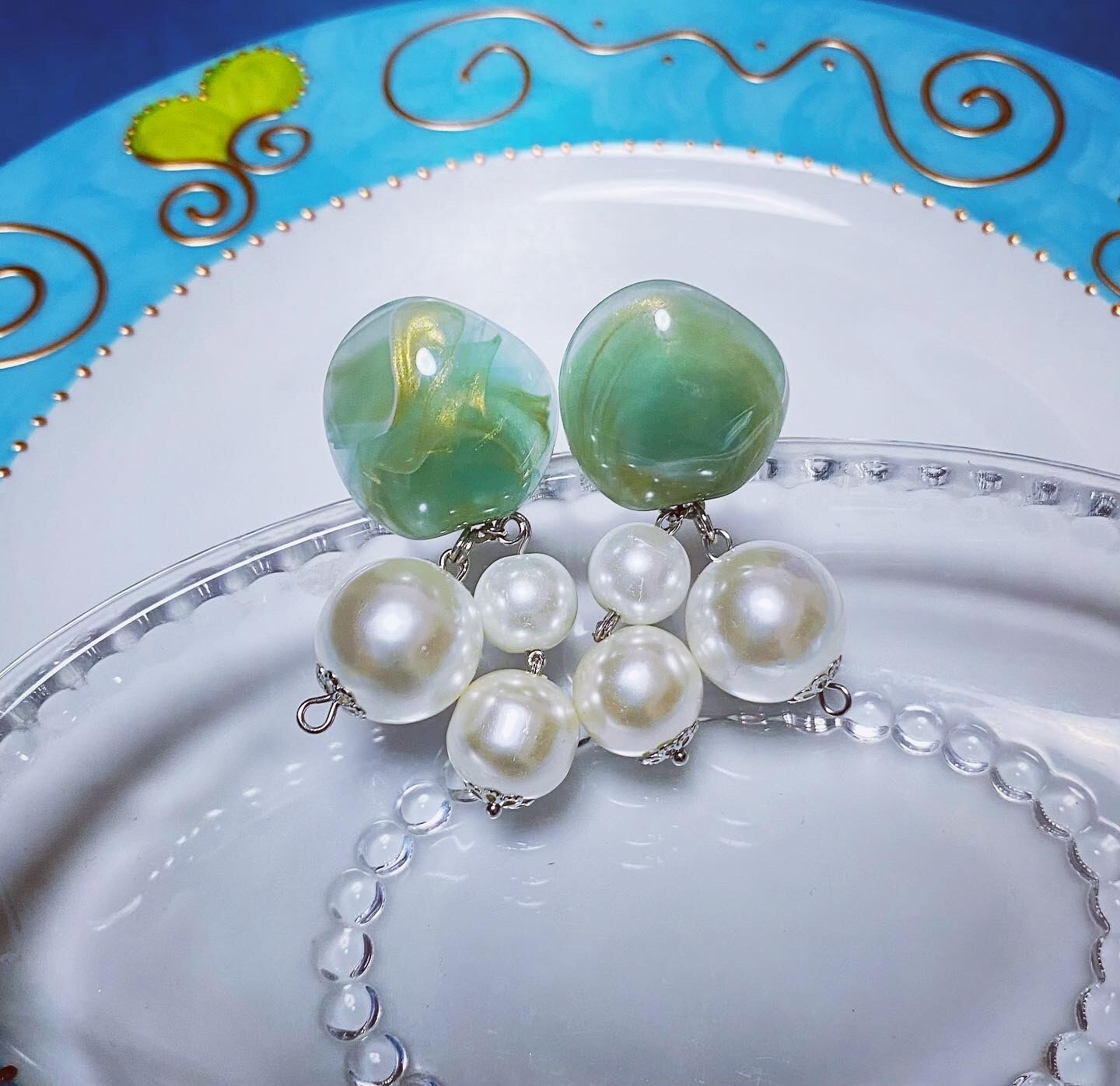 大きめのグリーンのカボションに、大きさの違うパールを合わせたピアスです。