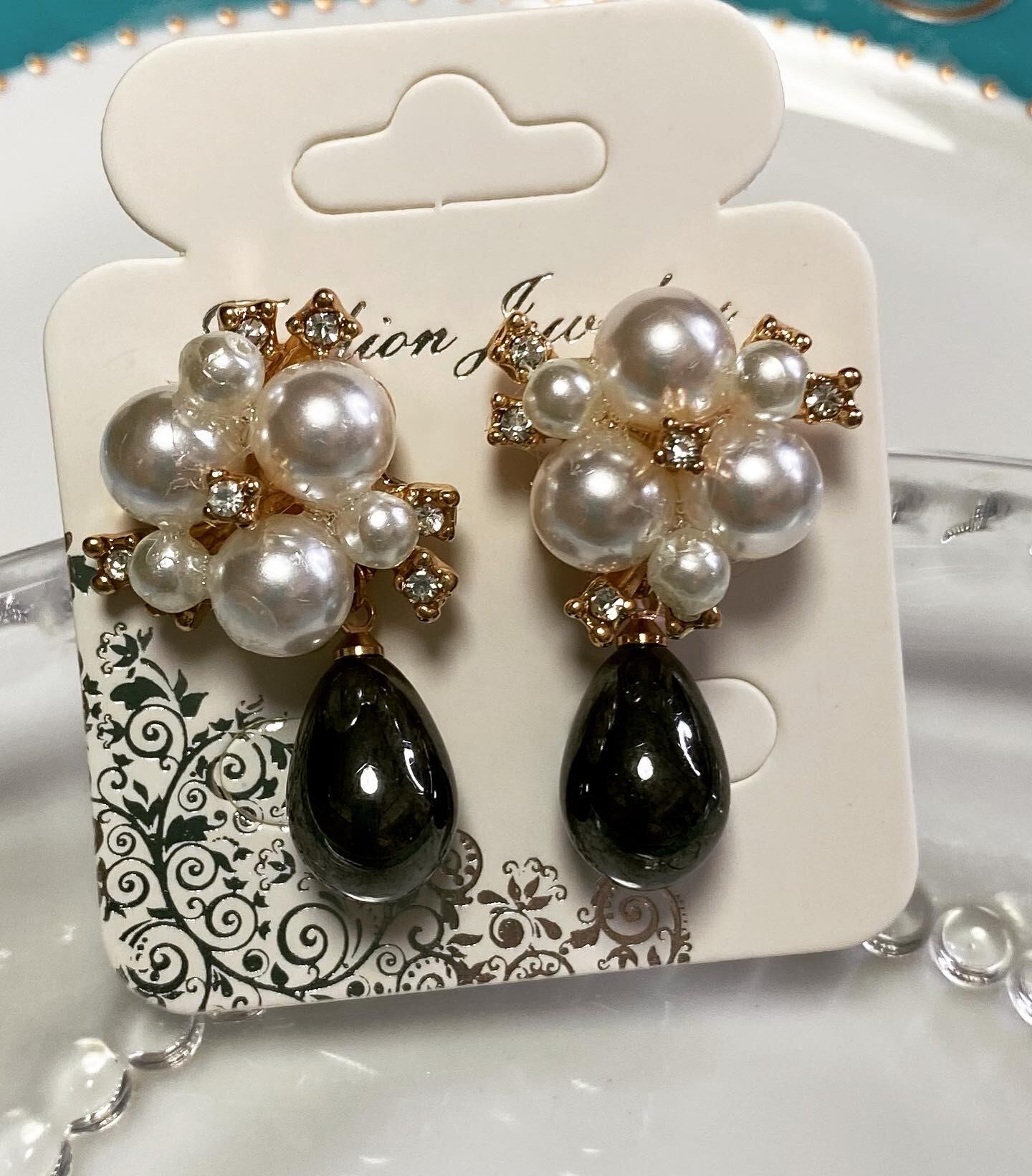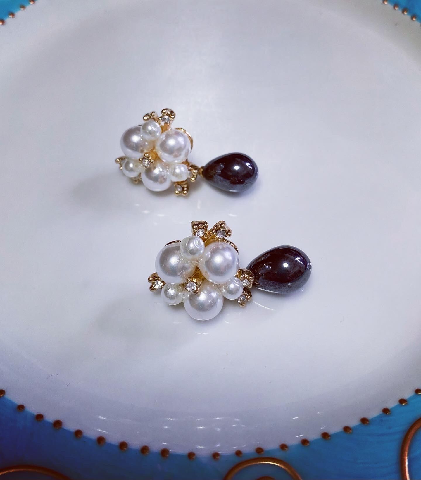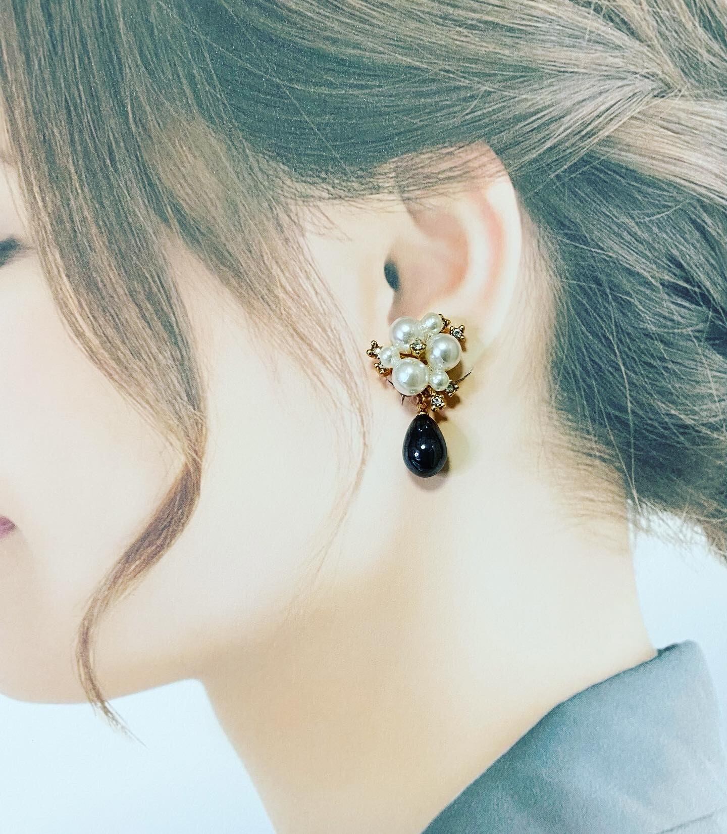 パールやビジューを合わせた華やかな カポションに、濃いネイビーグレーのしずく型パールを合わせました。
