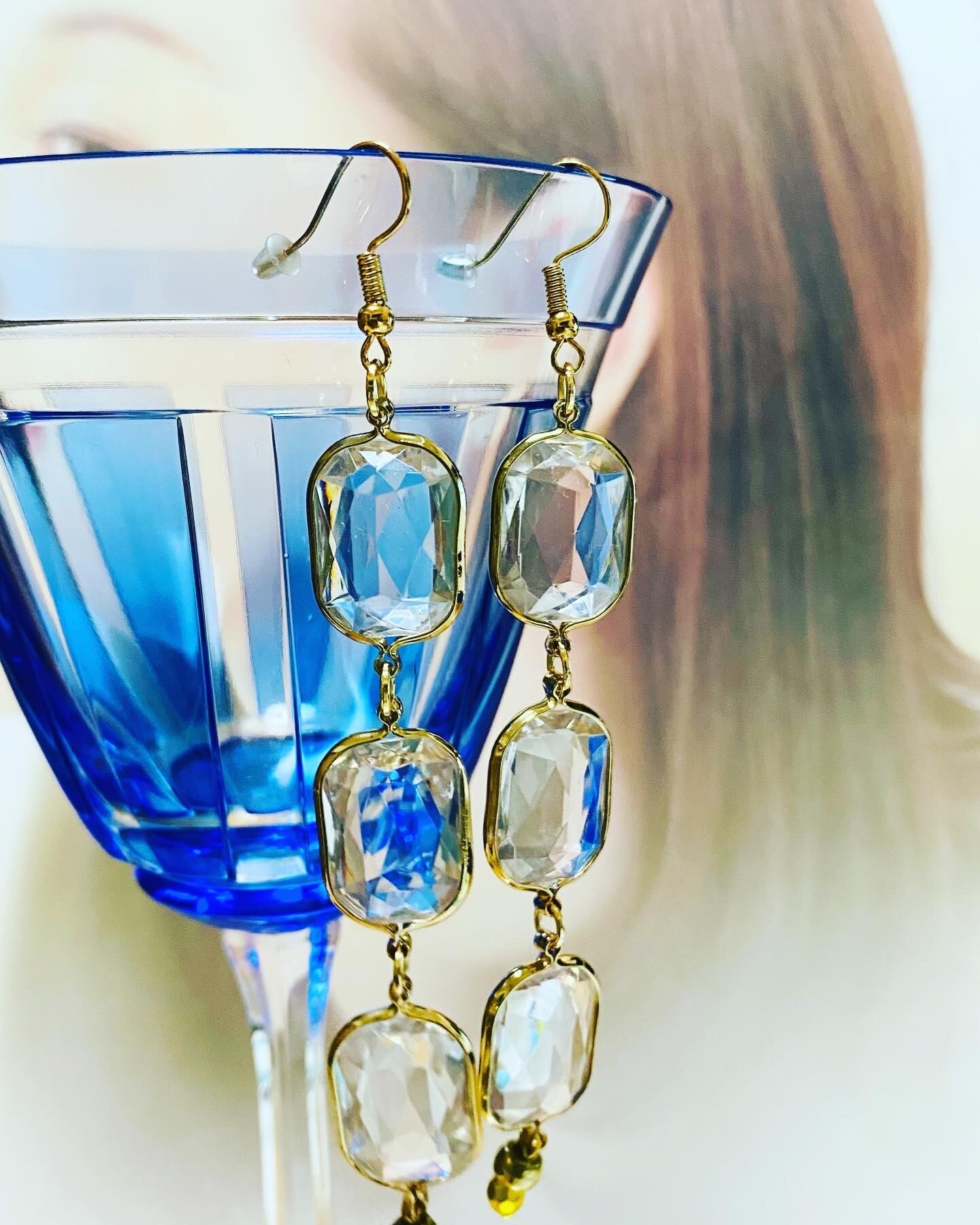 きらきら光を反射する多面体クリアビーズを3個をフックピアスに合わせました。