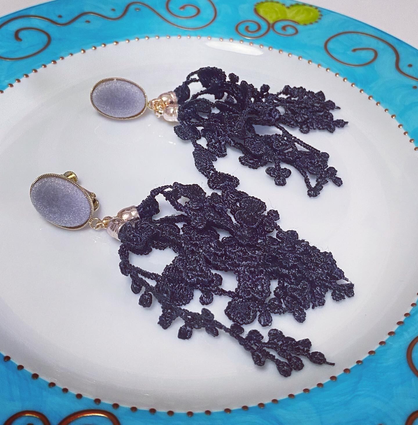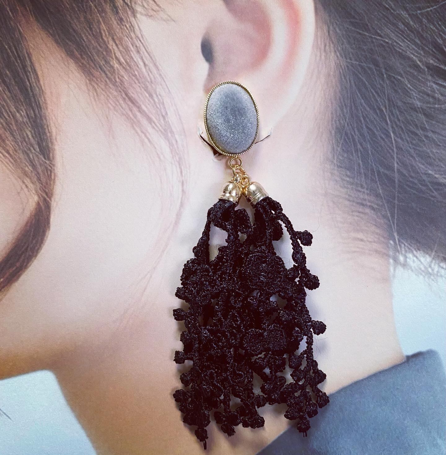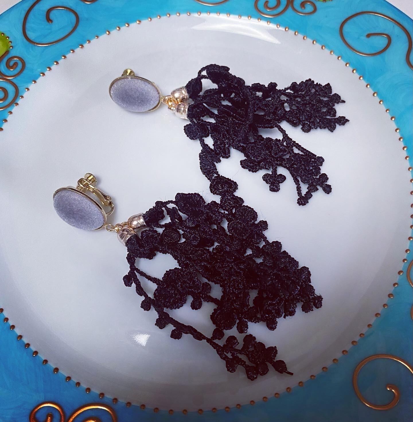 グレーのフロッキーのイヤリングに、ブラックのフラワーレースを2つ合わせました。