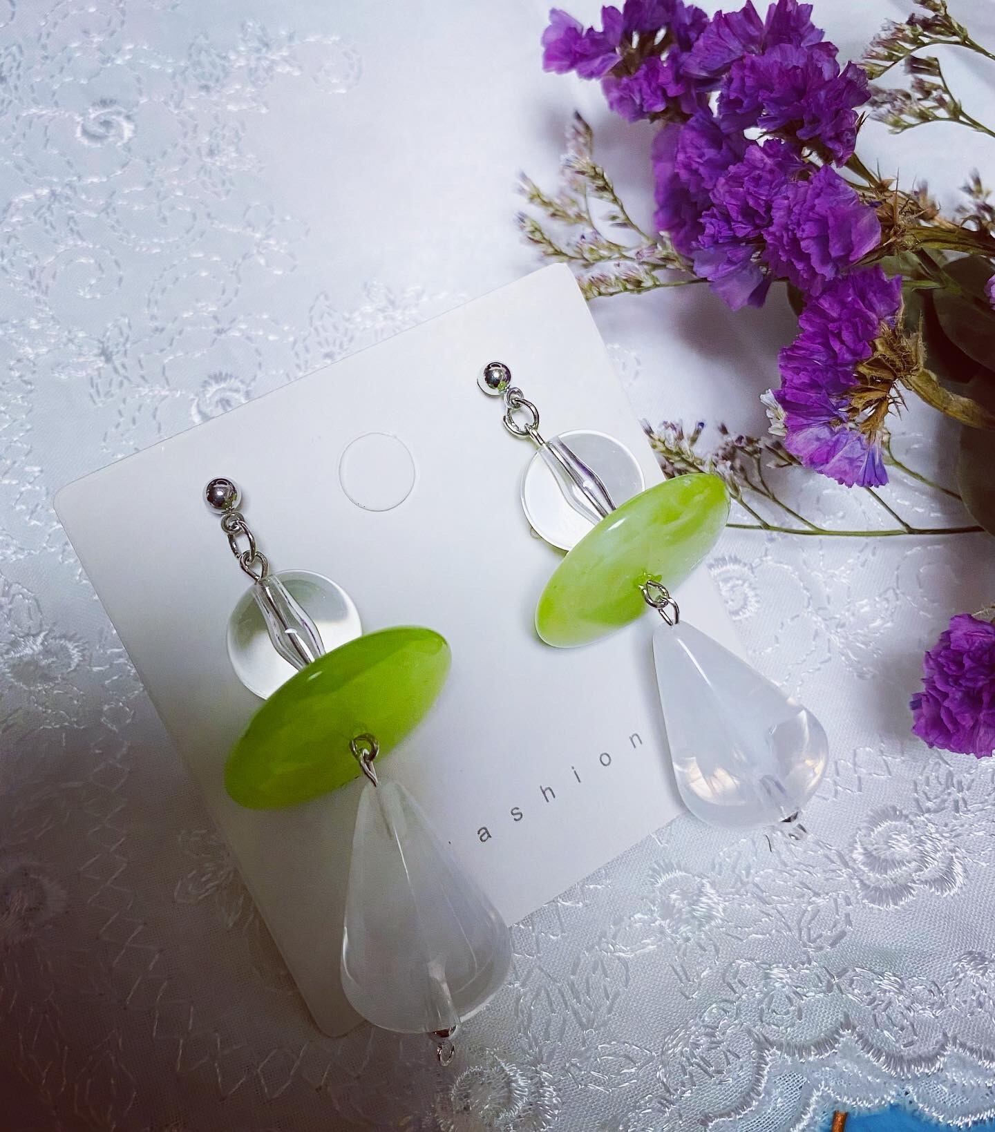 クリアビーズとマスカットカラーのビーズとを合わせたピアスです( ´ ▽ ` )