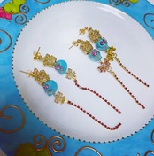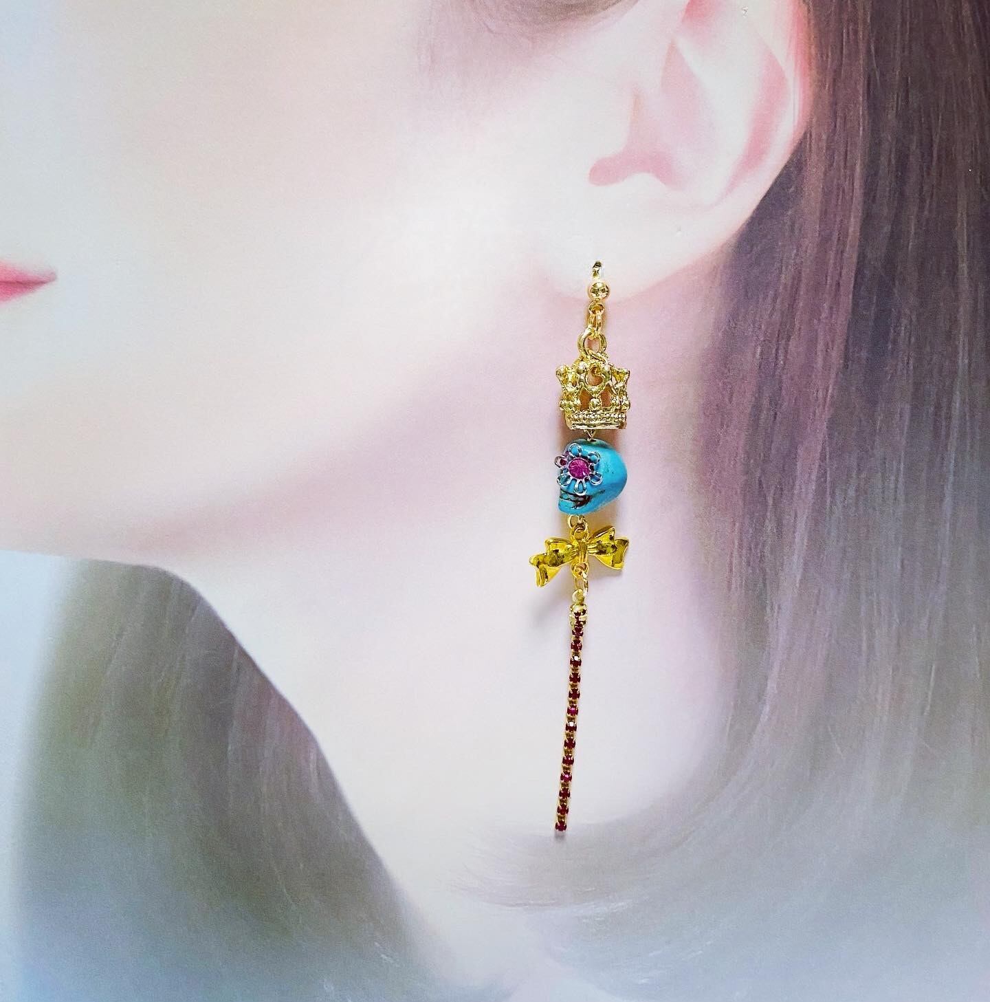 冠とリボンを付けて、ピンクのチェーンストーンを合わせた、個性的なピアスです♡