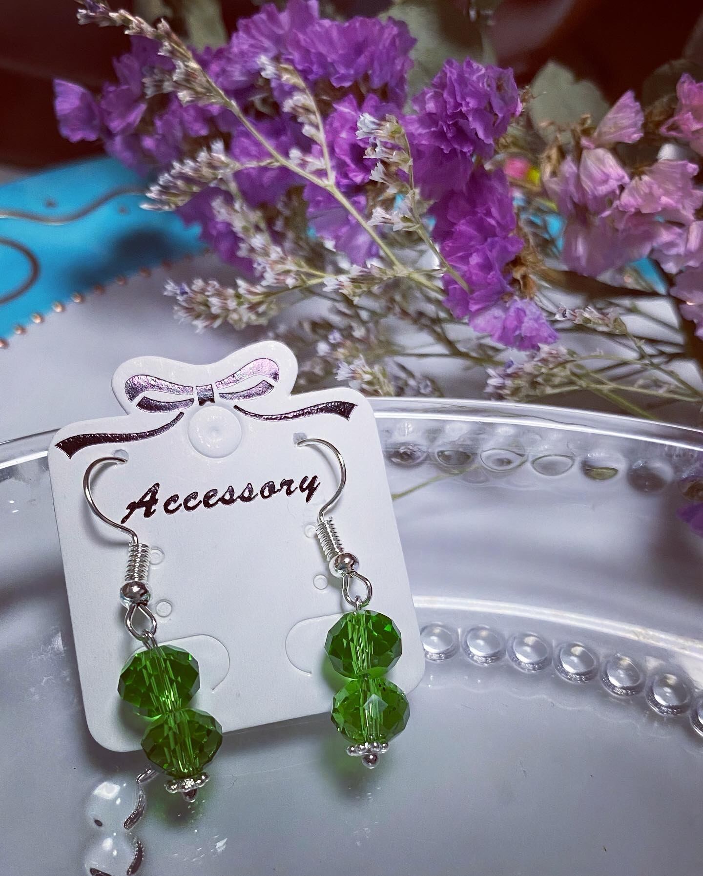 綺麗なグリーンのビーズを2つつけたフックピアスです( ´ ▽ ` )