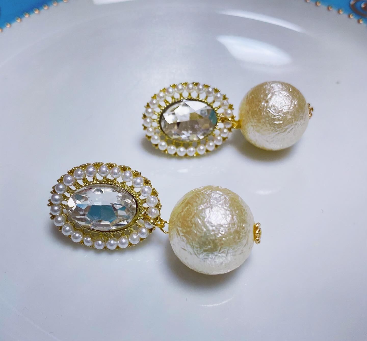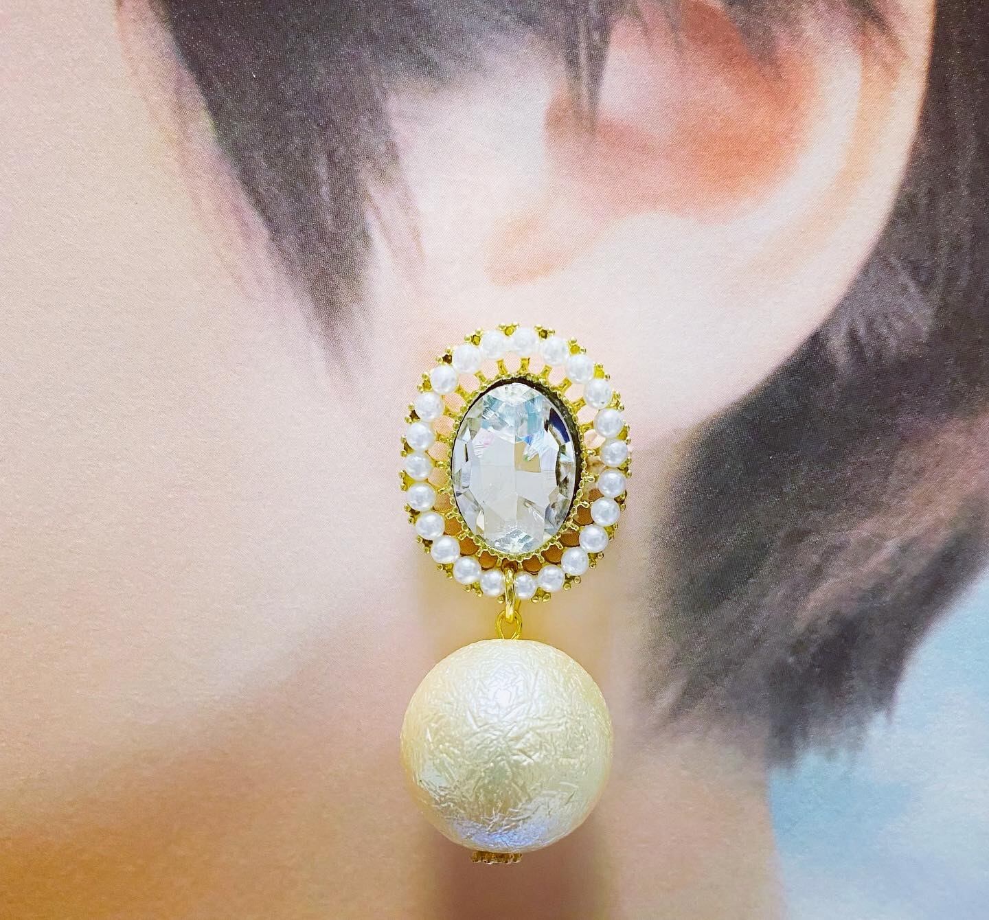パールの周りに小さなパールのついたカポションに、18mmのエアパールをあわせたピアスです( ´ ▽ ` )