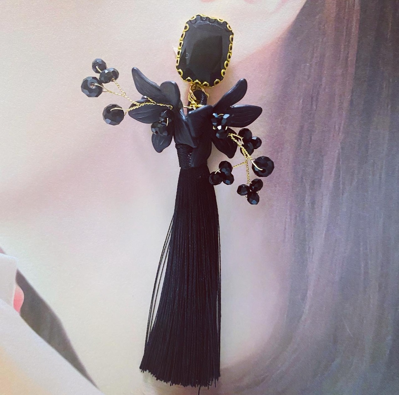 ブラックのガラスビーズのカポションに、ブラックのお花とロングタッセルを合わせたピアスです( ´ ▽ ` )