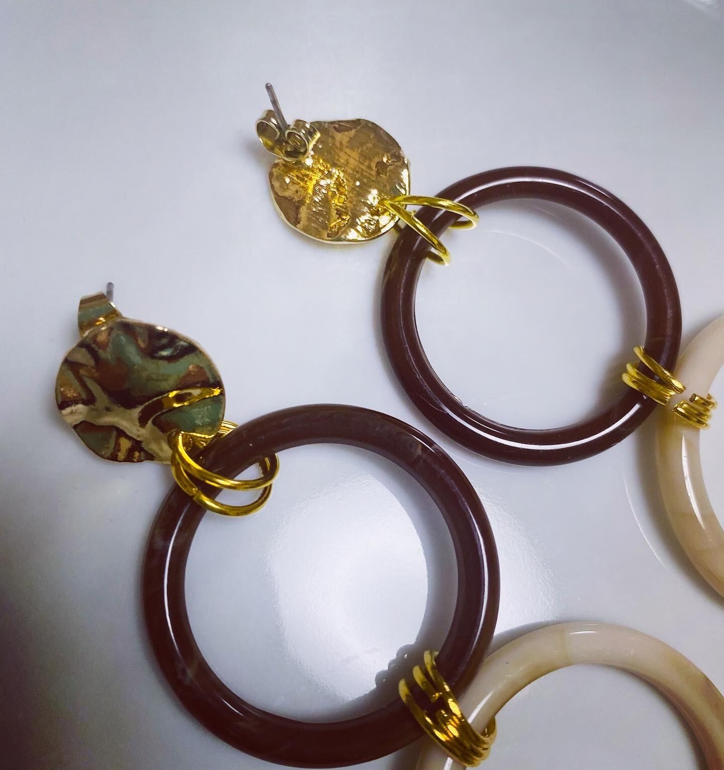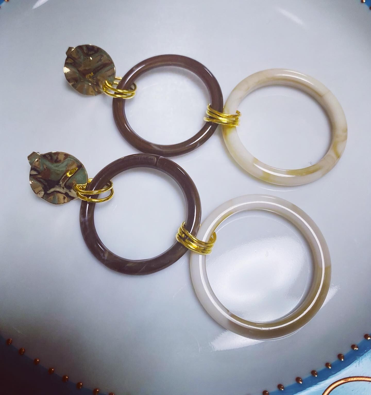 ブラウンのリングとアイボリーのリングを合わせて、ゴールド系の金具でピアスにしました♡