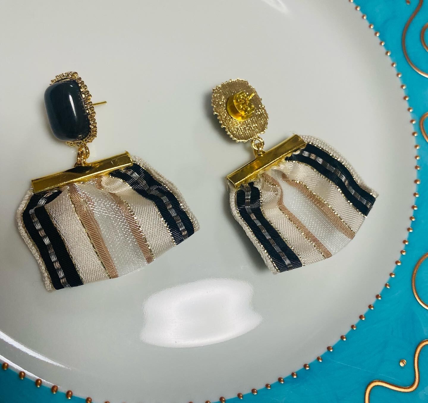 透明感のあるブラックのカボションに、透け感のある生地のタッセルを合わせたピアスです(^ ^)