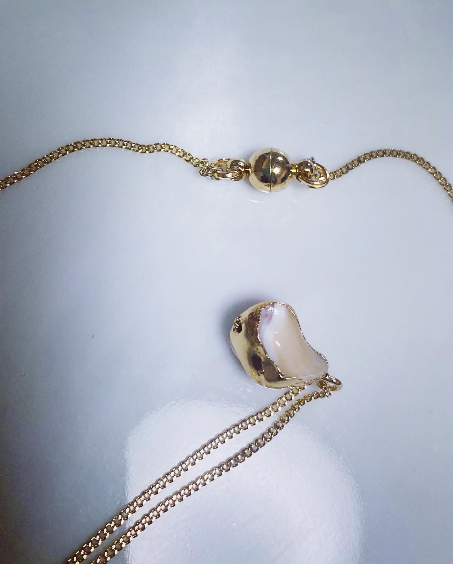 シェルビーズのトップにチェーンを合わせてペンダントにしています。