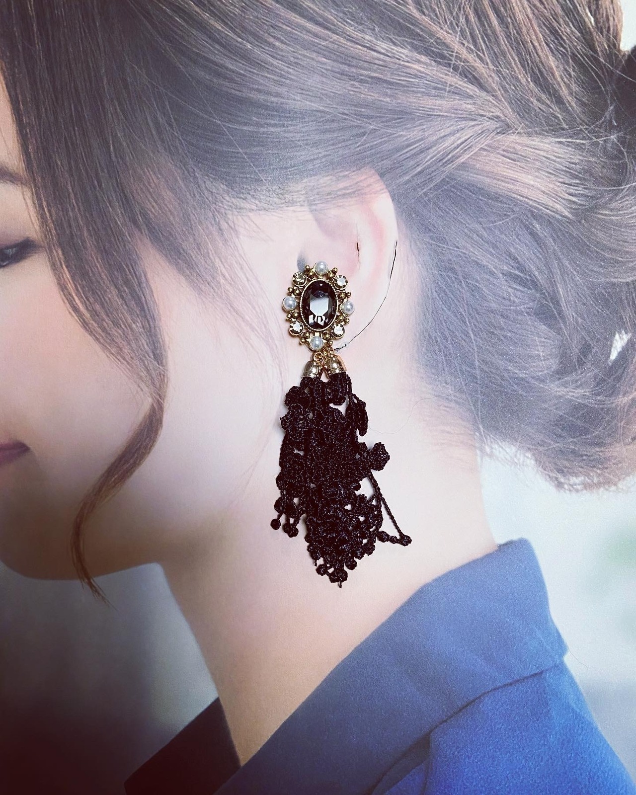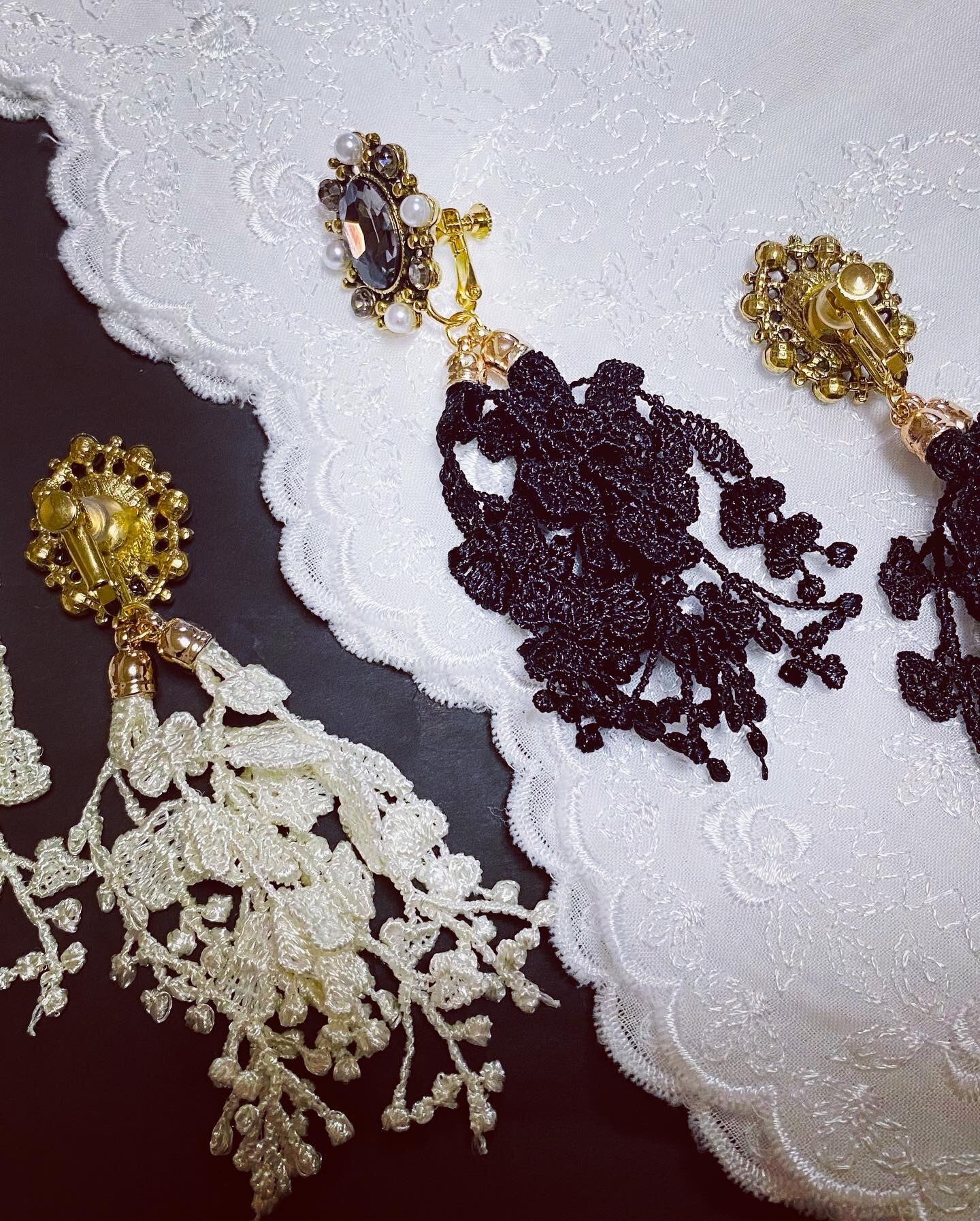 アンティーク様のガラスビーズやパールの華やかなカボションに、フラワーレースタッセルを合わせて華やかなイヤリングにしました(^^)