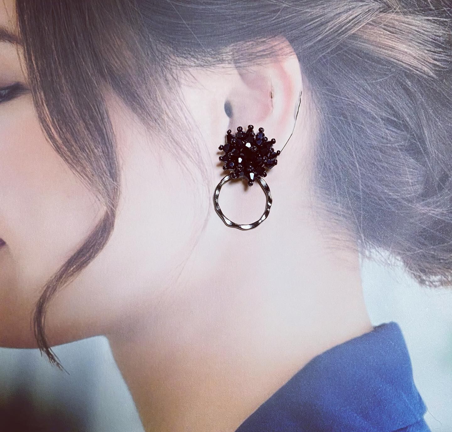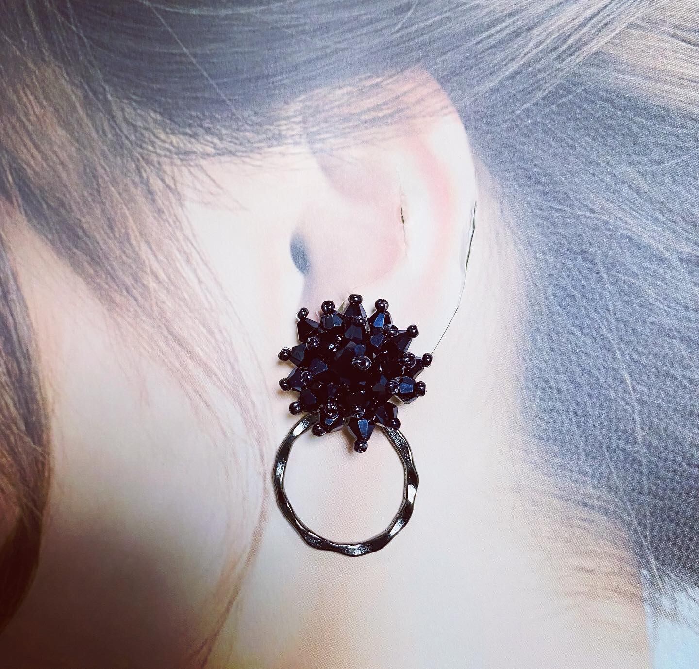 ブラックのビーズのお花に、リングを合わせたピアスです( ´ ▽ ` )