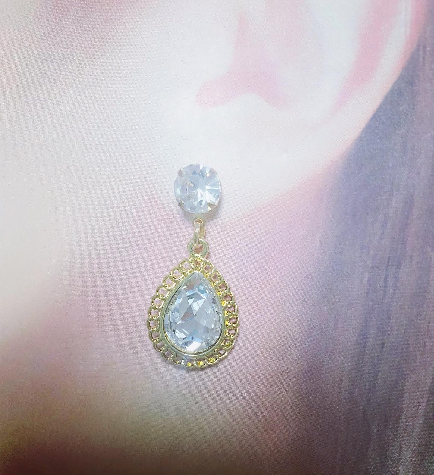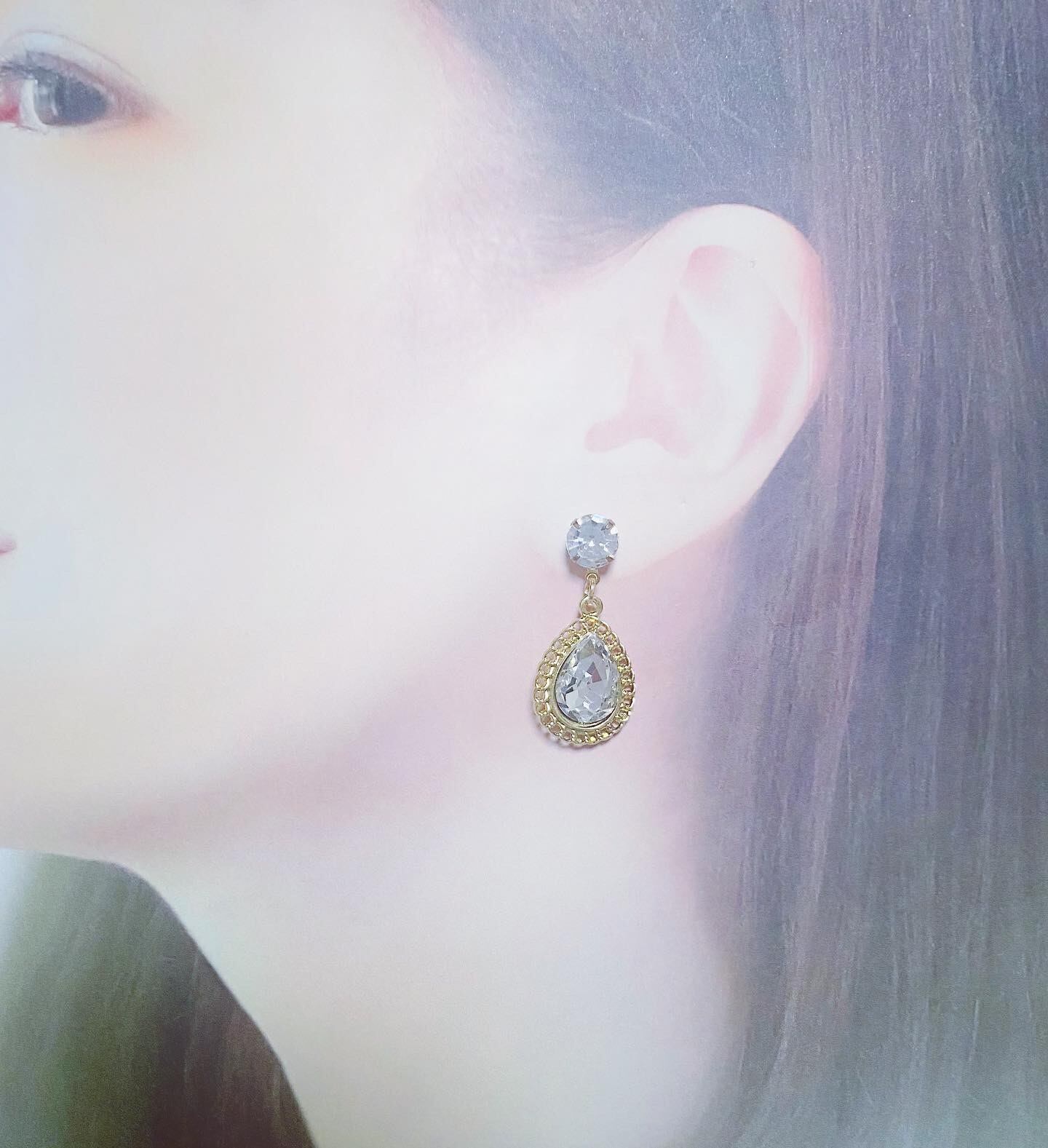 ラインストーンのピアスにしずく型のガラスビーズを合わせました。