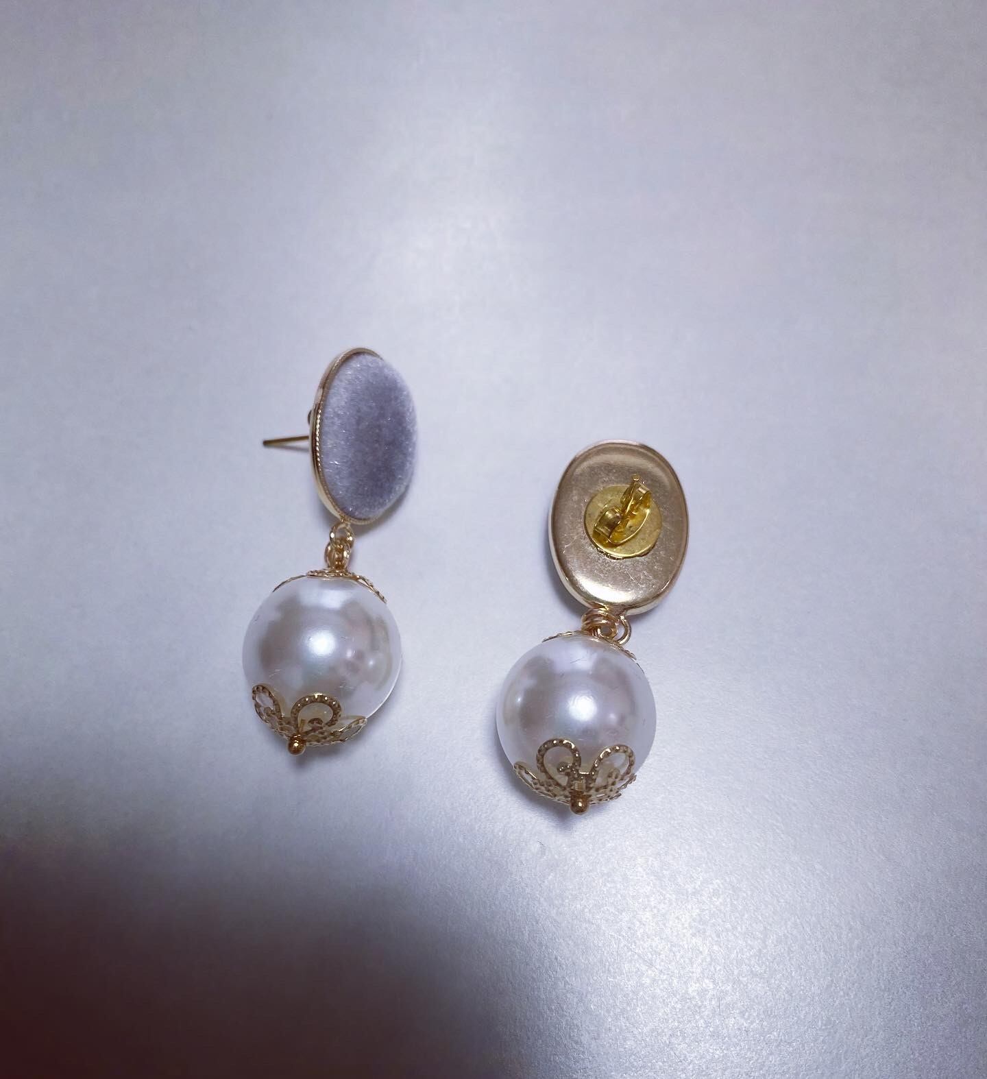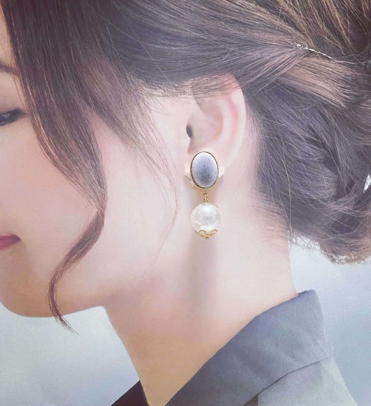 グレーのオーバル型のフロッキーの周りを、ゴールドタイプの縁取りのあるカボションに、18mmのパールを合わせました。