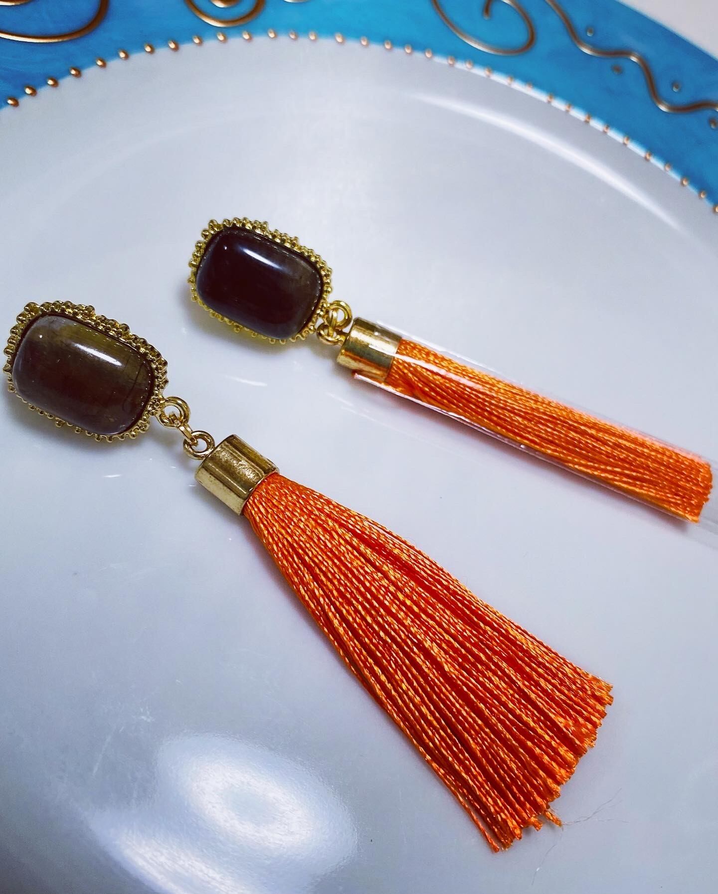 華やかなオレンジのタッセルがアクセントになるピアスです。