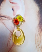 黄色と赤いお花とシルバーを閉じ込めたカボションに、透明感のある淡いイエローのチャームを合わせたピアスです(^^)
