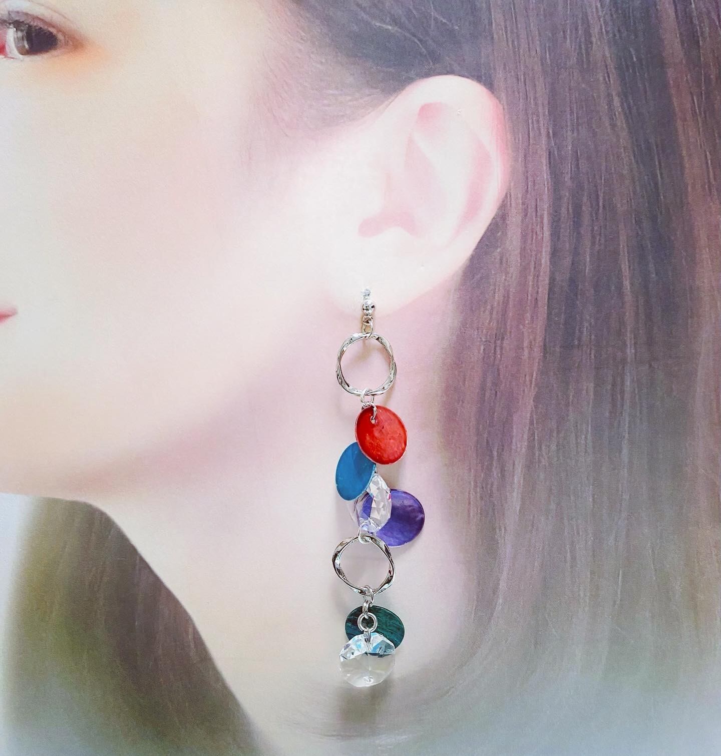 いろんなカラーのシェルプレートと、光を反射するクリアガラス、そしてシルバーリングが織りなす輝きが綺麗なピアスです。