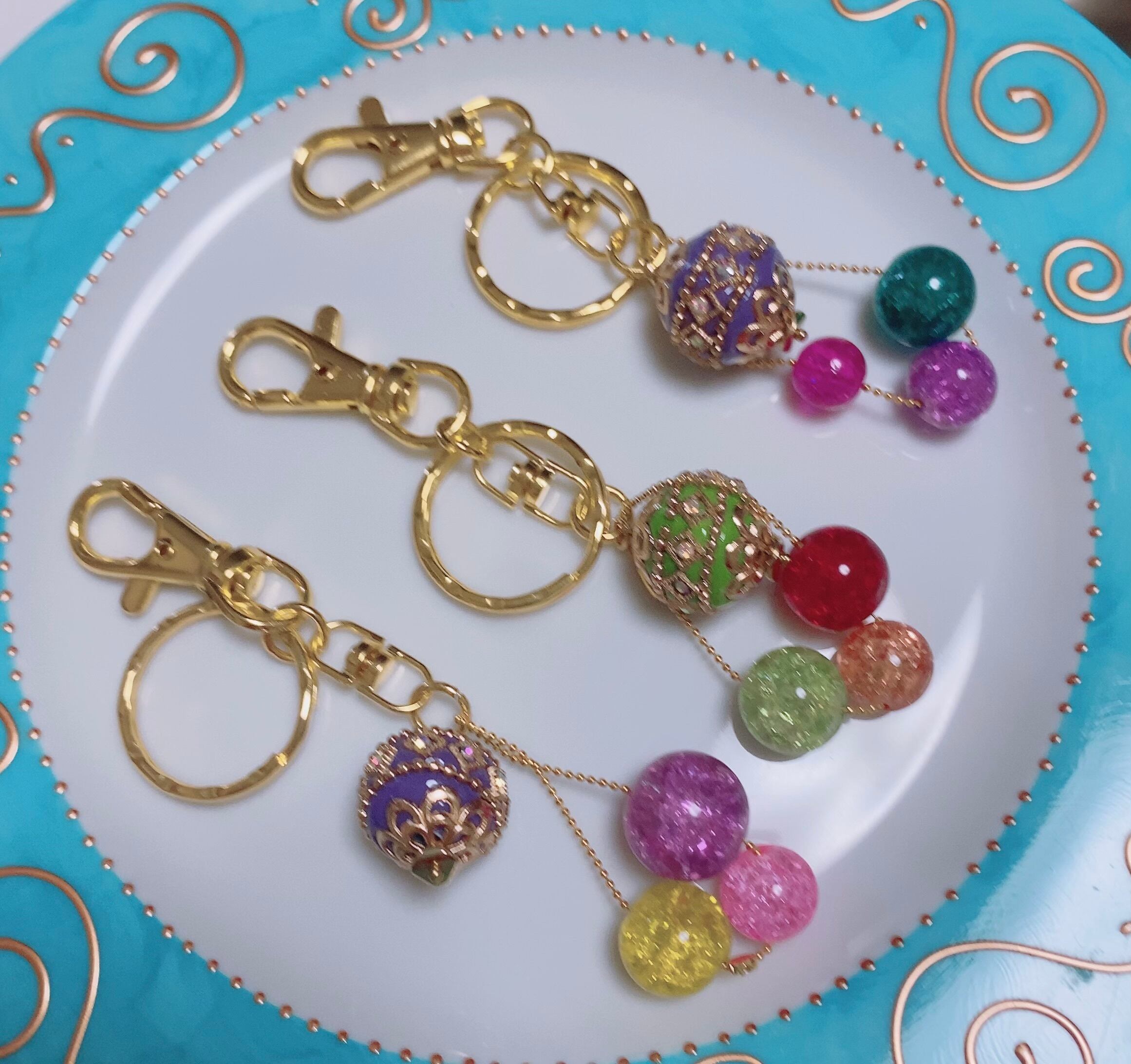 表面に金で模様が入ったものやカラーボールビーズを合わせたキーホルダーです。