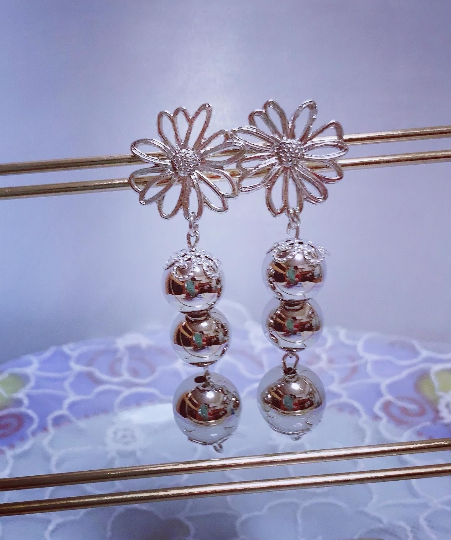 シルバーカラーのメタルフラワーをカボションにして、シルバーカラーのボールの上下に菊座をつけてピアスにしました( ´ ▽ ` )