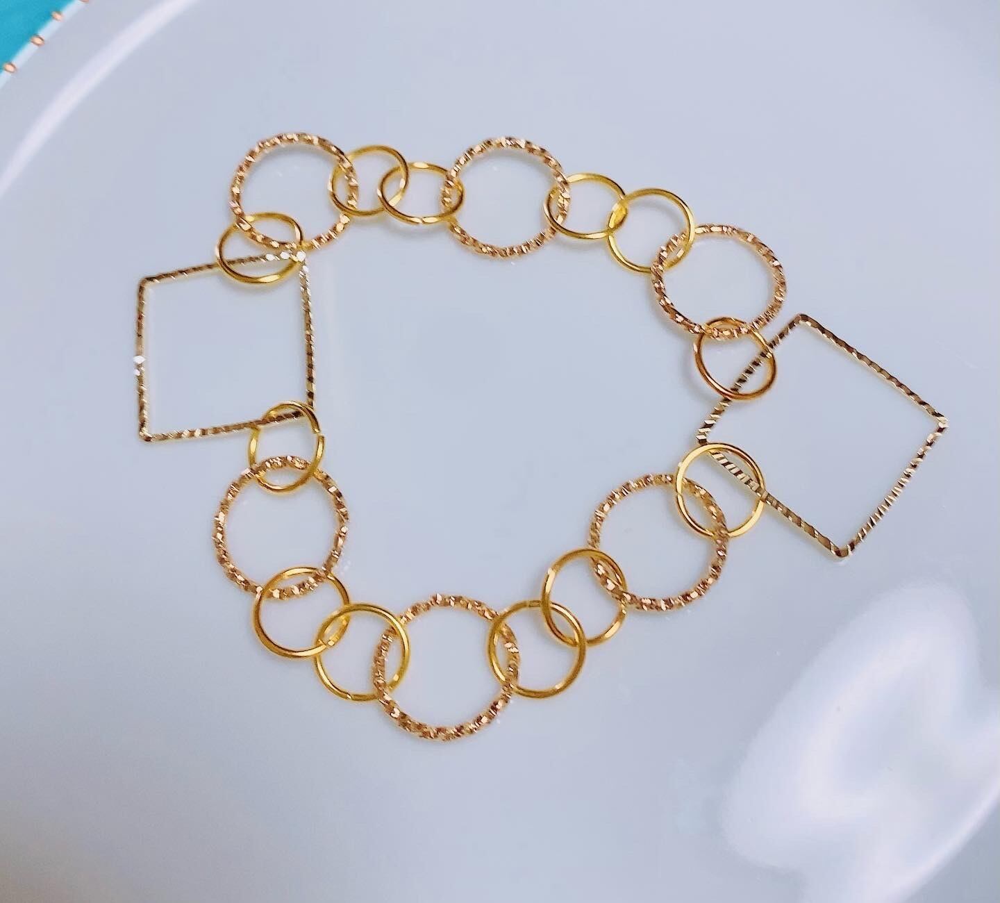 ゴールドカラーのリングやスクエアのフレームを合わせたブレスレットです。