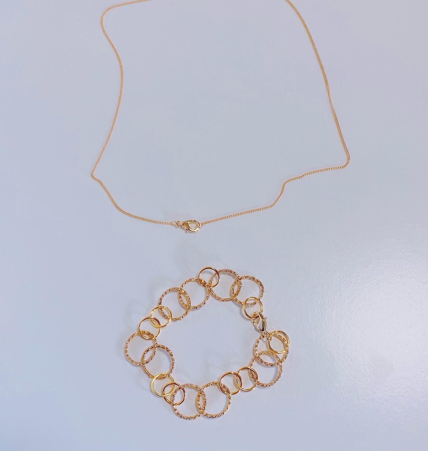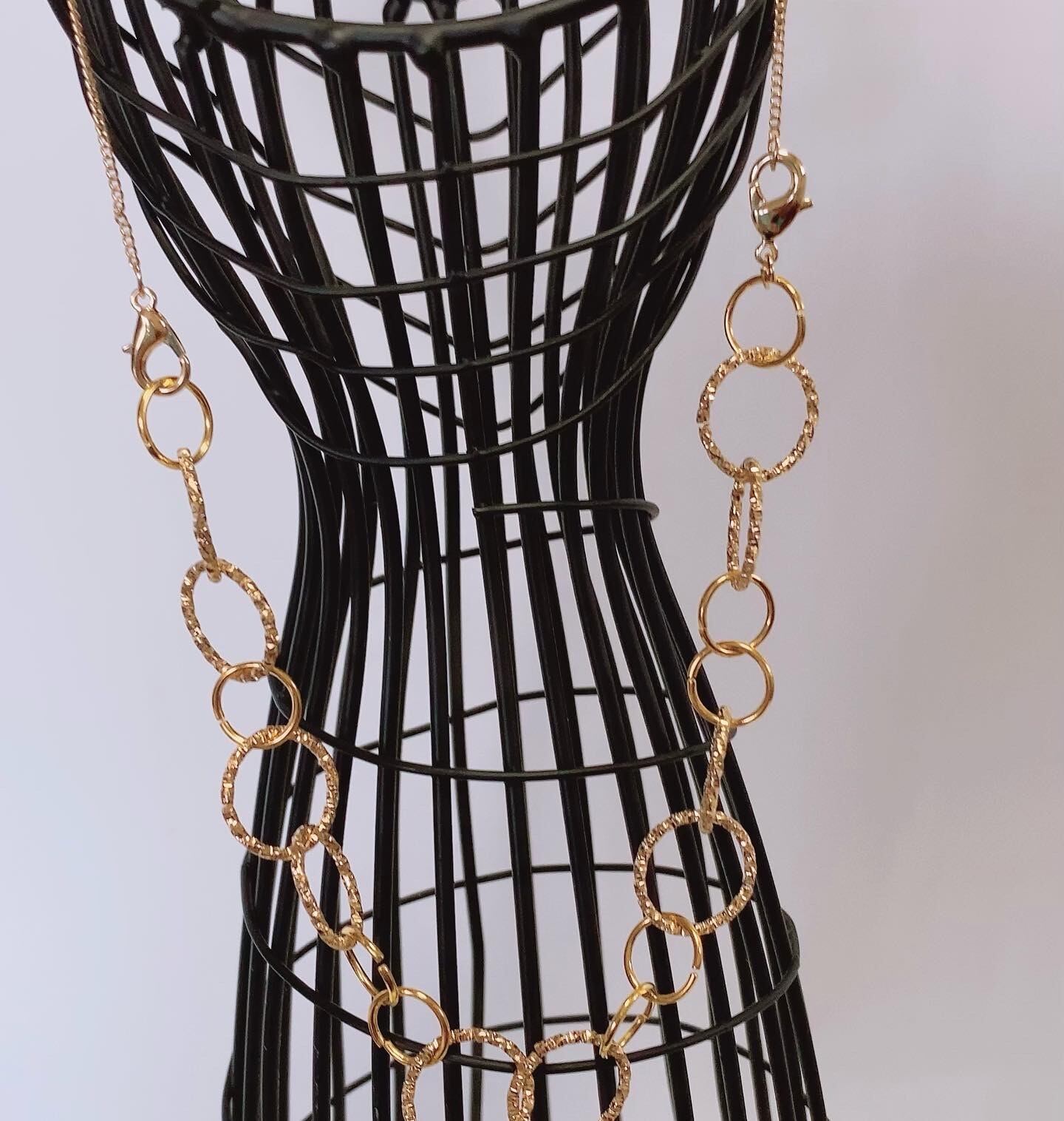 きらきら光を反射して光るリングを繋げたものを、ゴールドカラーチェーンと合わせてネックレスにしました。