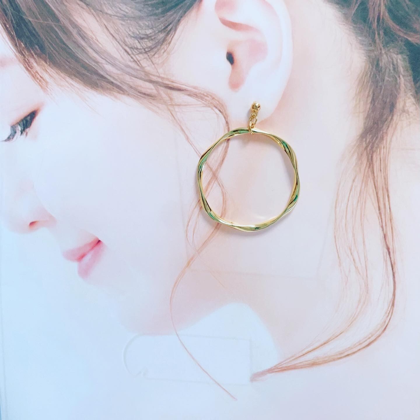 大きめのゴールドカラーのねじれリングのシンプルなピアスとイヤリングです。