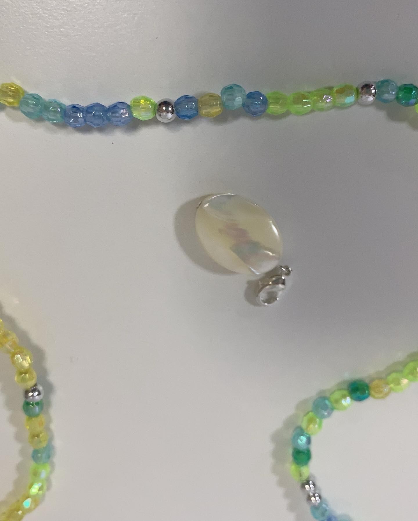 メガネかけのところのナスカンで繋げて、セットのシェルビーズトップをつけると、シェルトップのビーズネックレスになります。