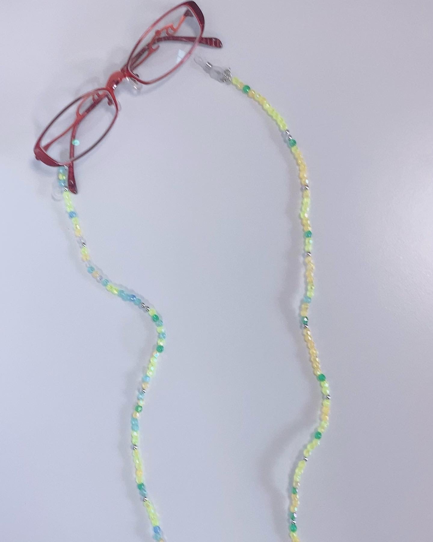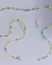 グリーンやブルー、シルバーのビーズのメガネチェーンです。