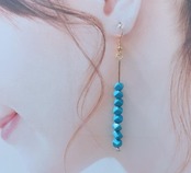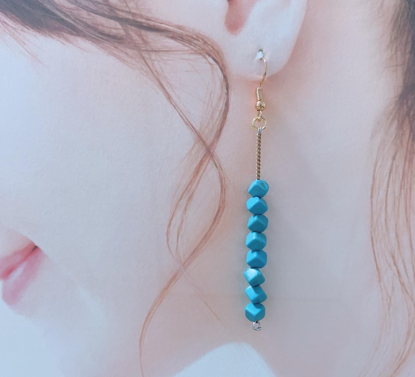 ターコイズのチューブを、7〜8つチェーンに通したピアスとイヤリングです。