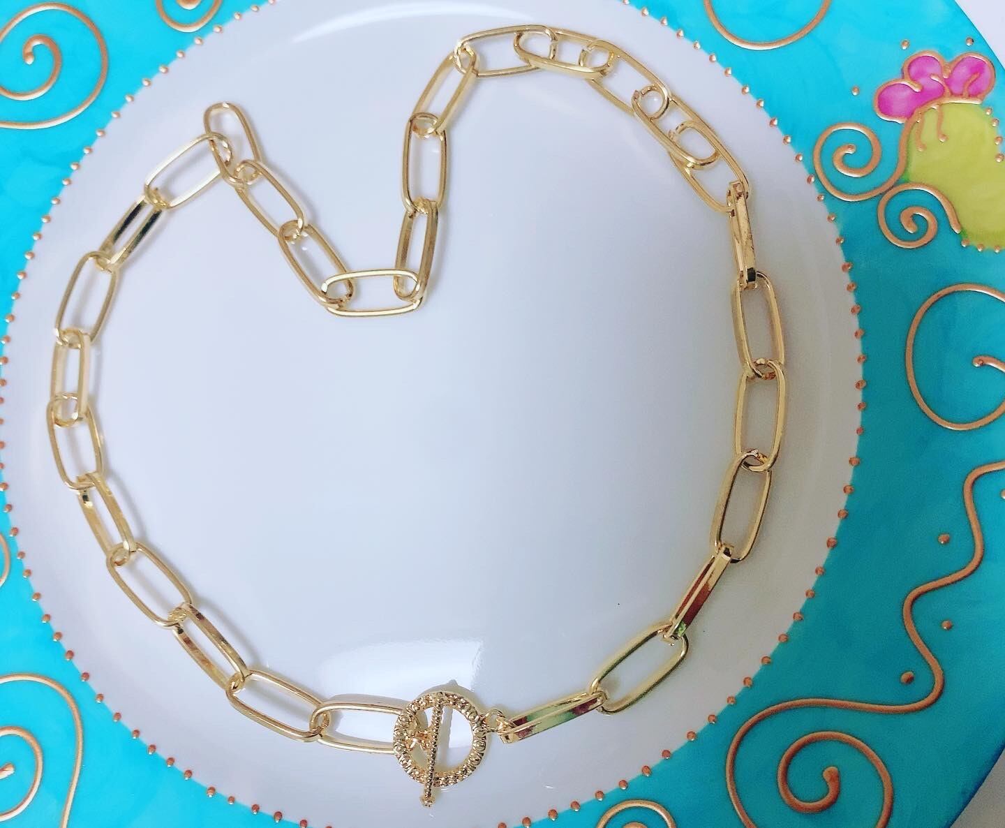 幅8mm.縦19mmのボリュームのある小豆チェーンにマンテルを付けてネックレスにしました。