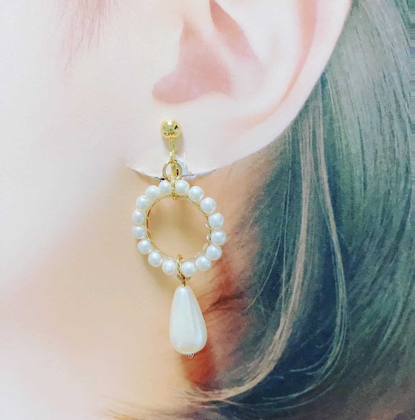 リングに小さなイミテーションパールを巻き付けたものに、ドロップパールを一つ垂らしたイヤリングです。