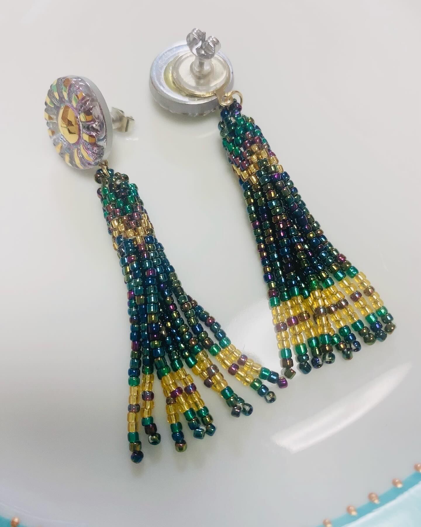角度で光を放つ瞳のようなカボションに、グリーンやイエロー、ブラウンなどのカラービーズのタッセルを合わせた個性的なピアスです。