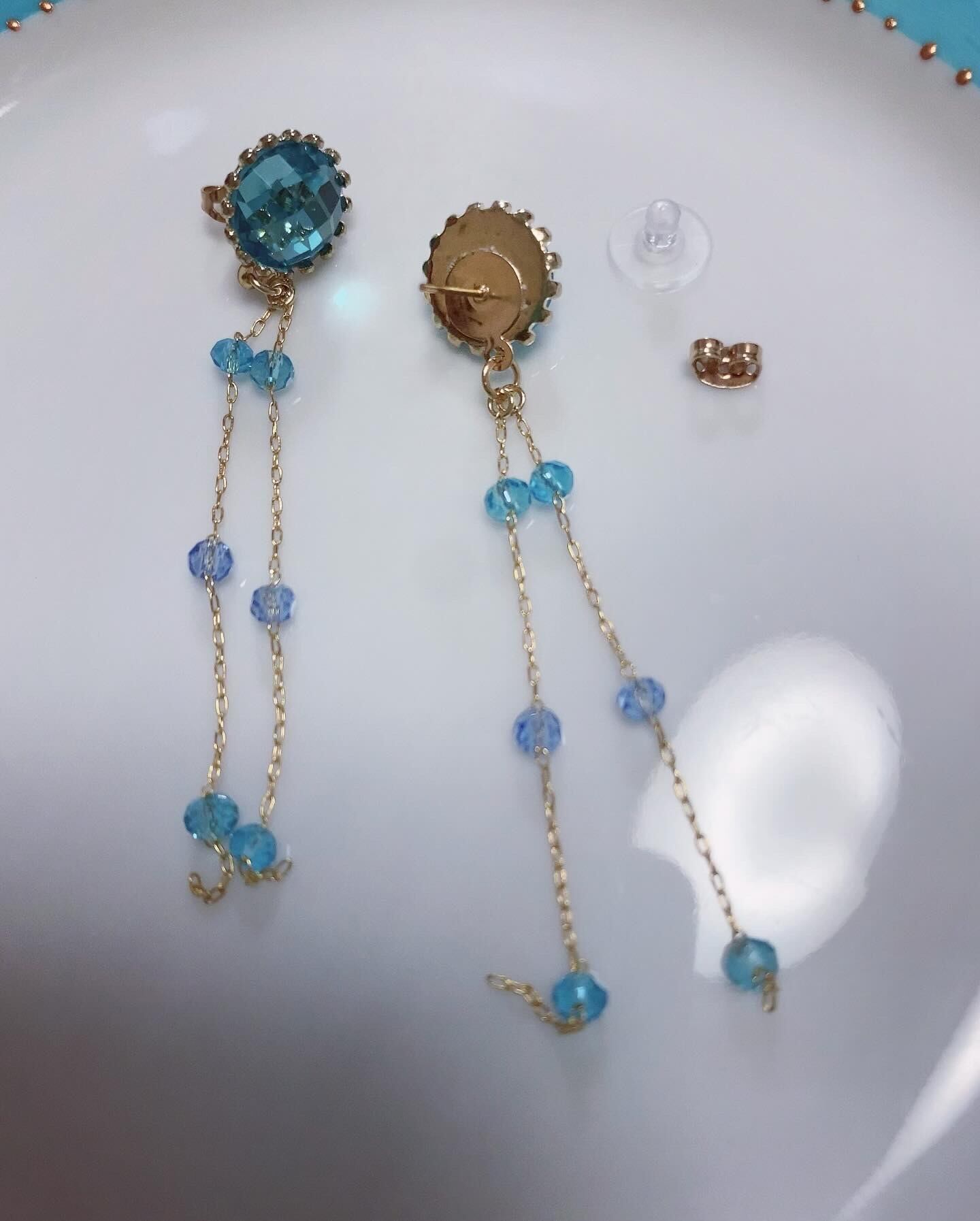 すっきりしたスカイブルーのカボションに、チェーンにブルーのビーズを散らばめたチェーンを合わせたピアスです。