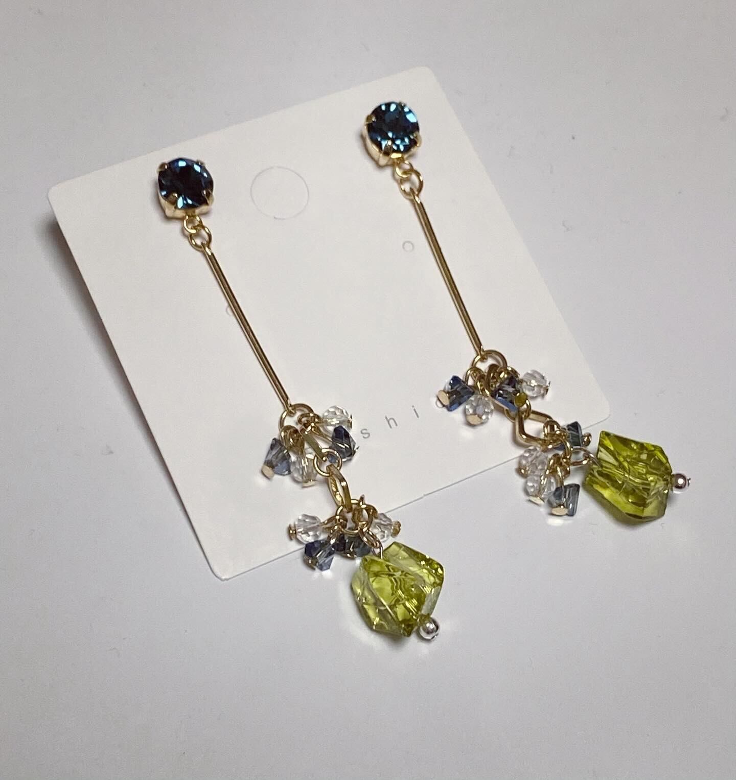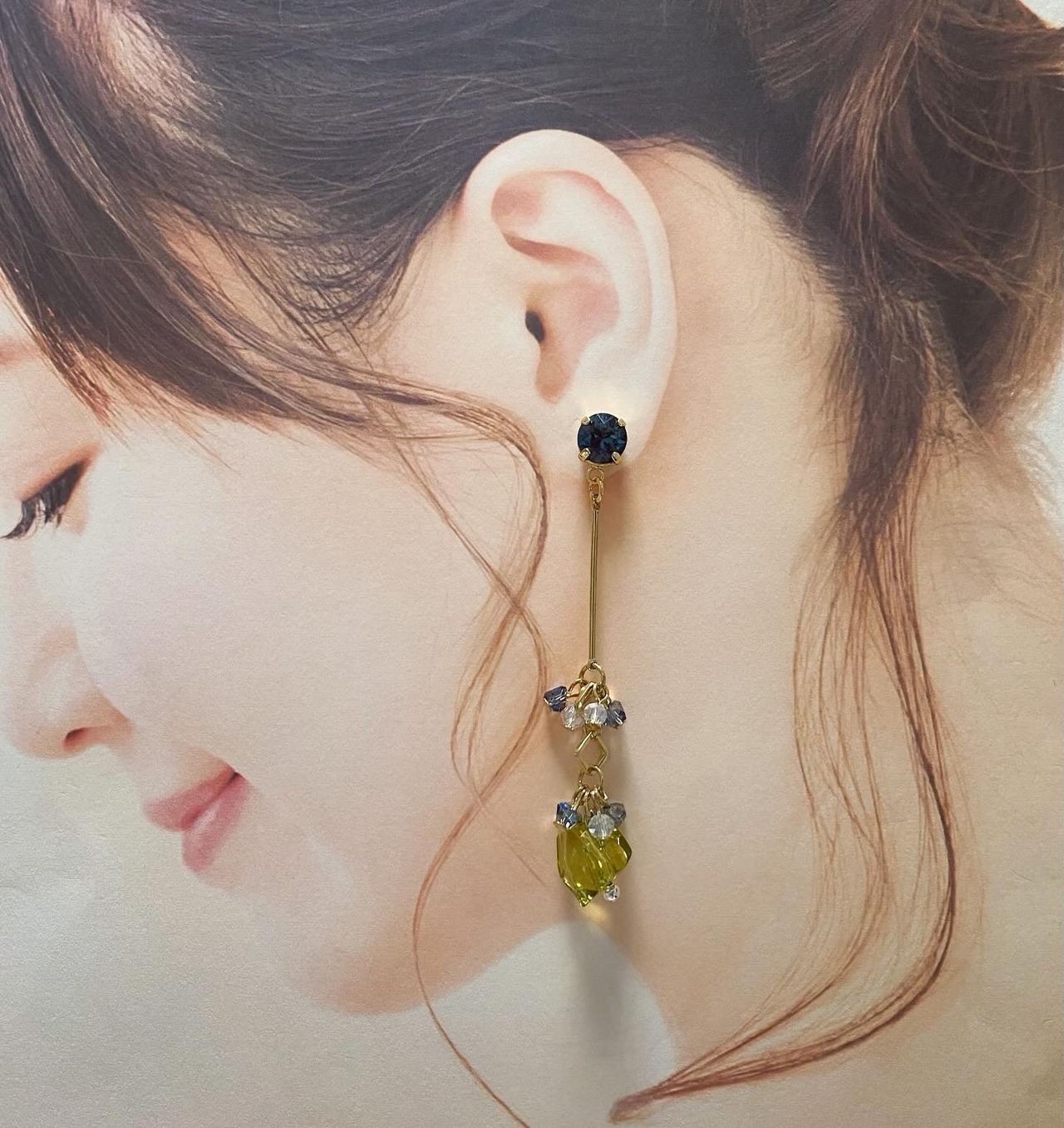 ビジューのカボションに、小さなガラスビーズをつけたバーを合わせ、その際に透明感のあるガラスビーズを付けた動きのある繊細なピアスです♡