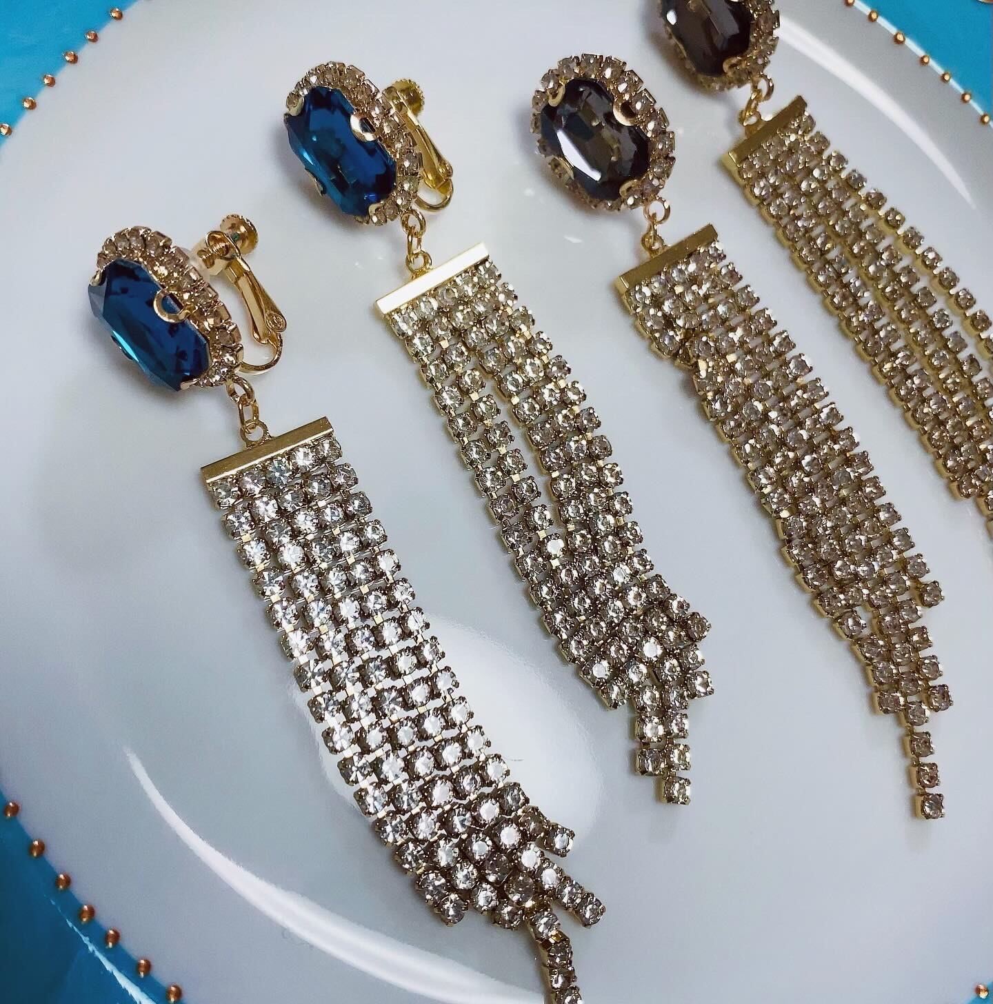ゴージャスなガラスビーズと人気のラインストーンタッセルを合わせたピアスとイヤリングです⭐︎