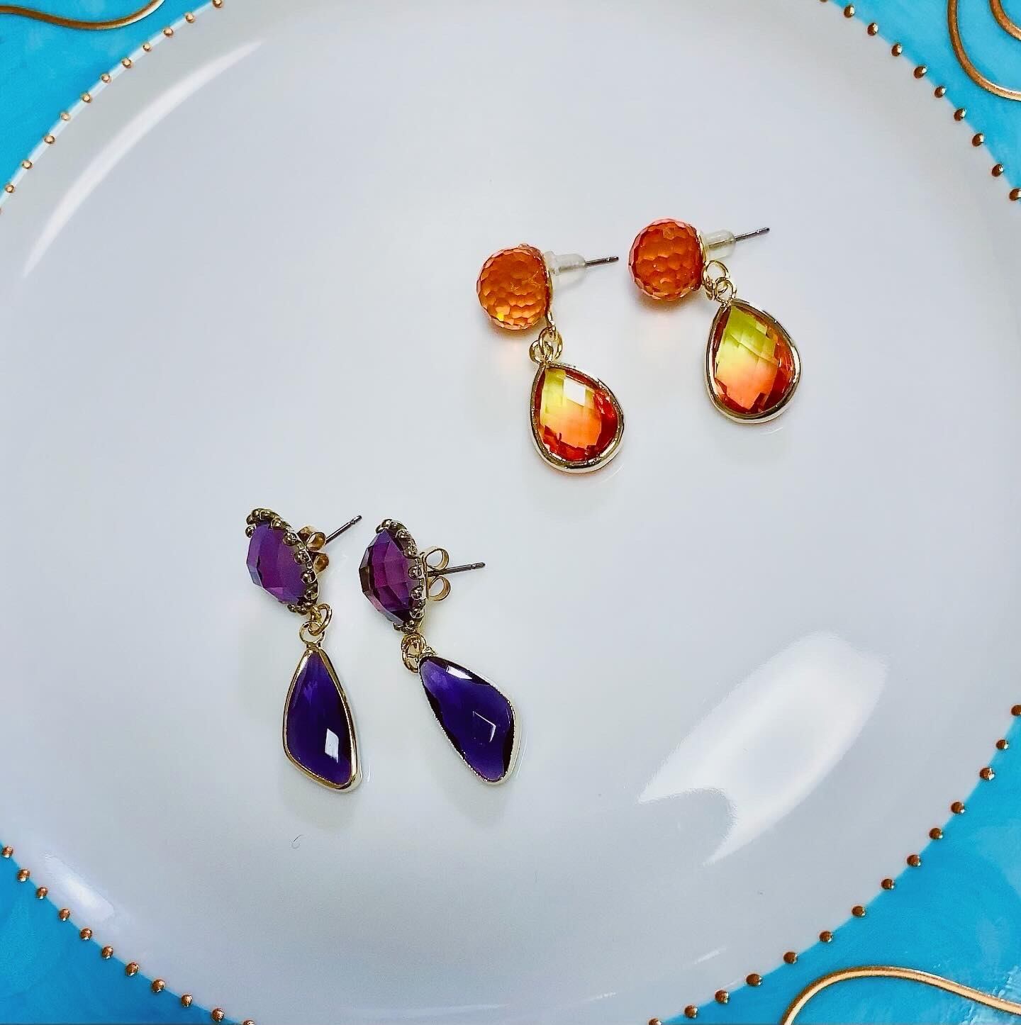 カボションとチャームのカラーをパープルで合わせたピアスです。